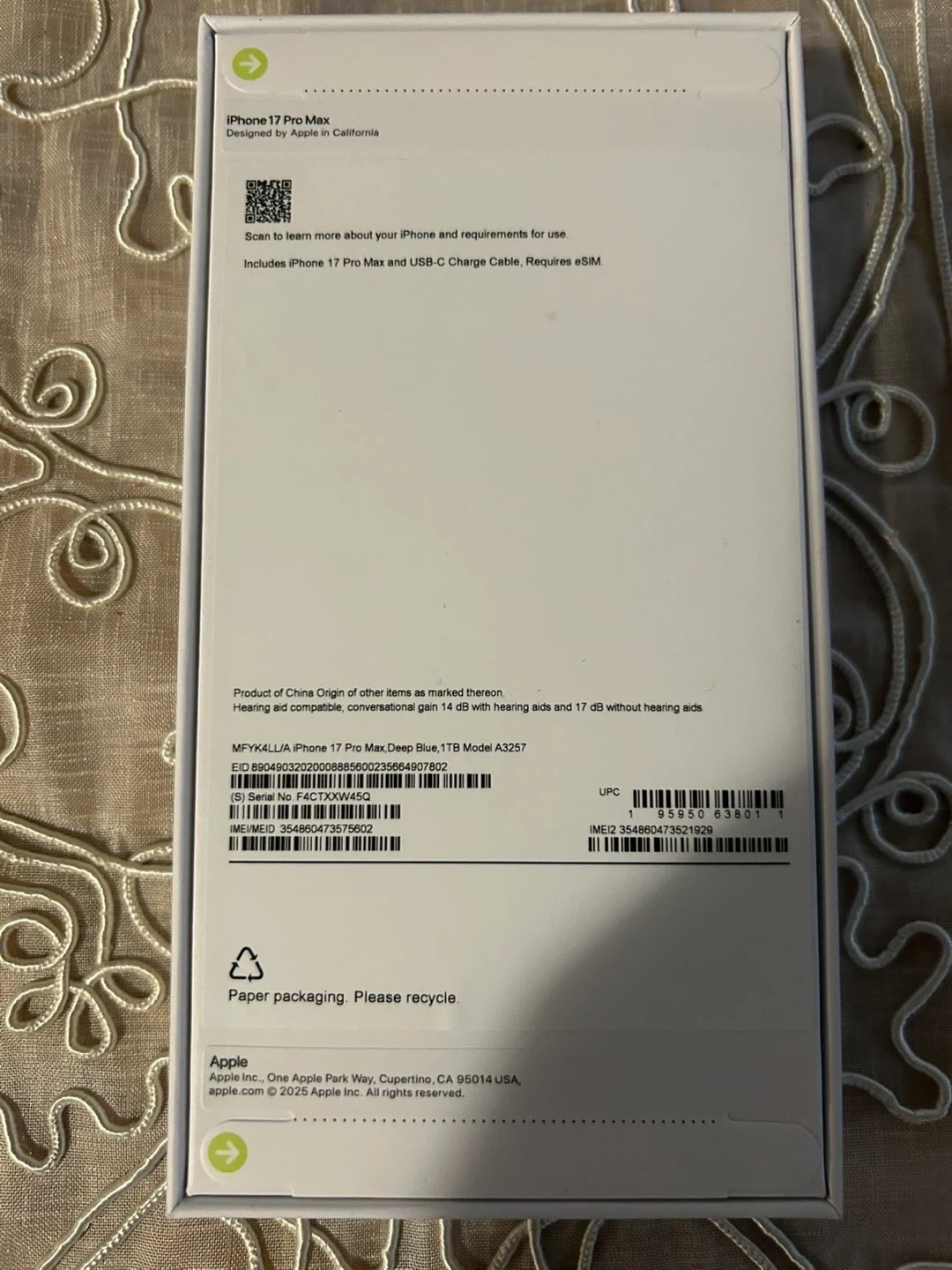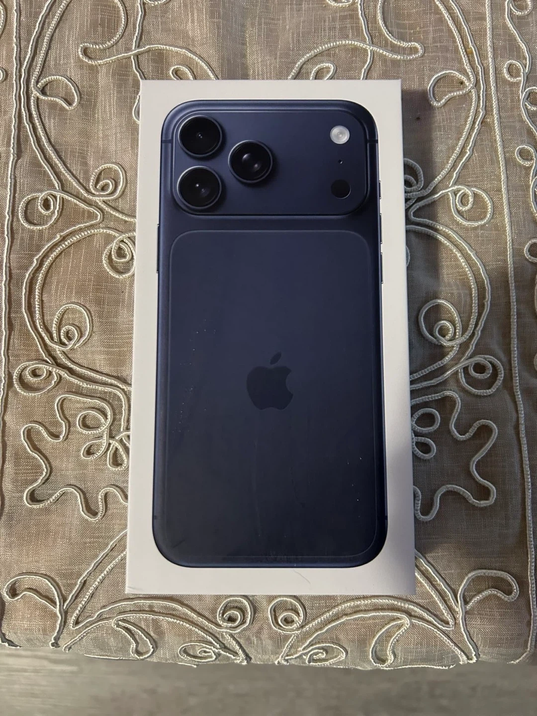 This is an Apple iPhone 17 Pro Max. It's a Deep Blue colour with 1TB of storage. Includes iPhone 17 Pro Max and USB-C Charge Cable, requires eSIM.