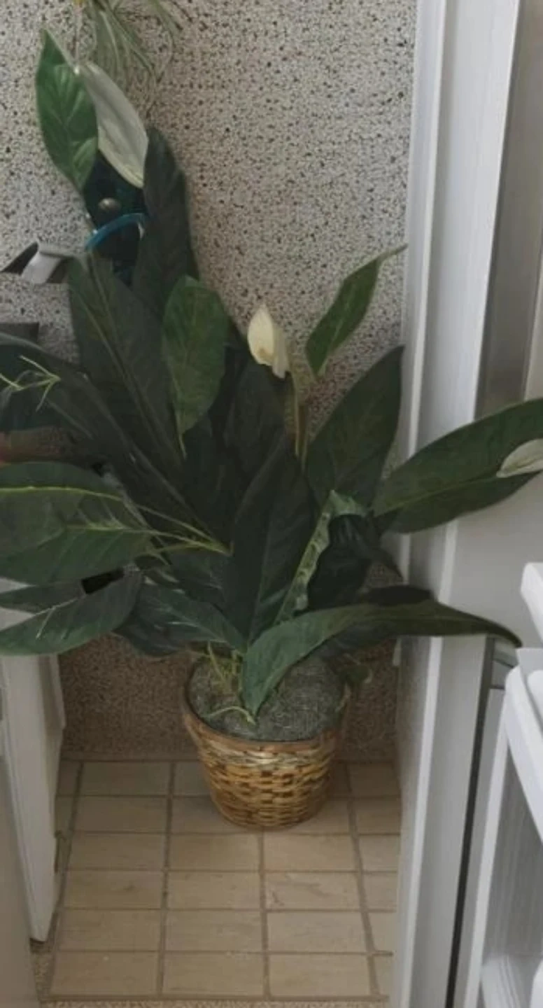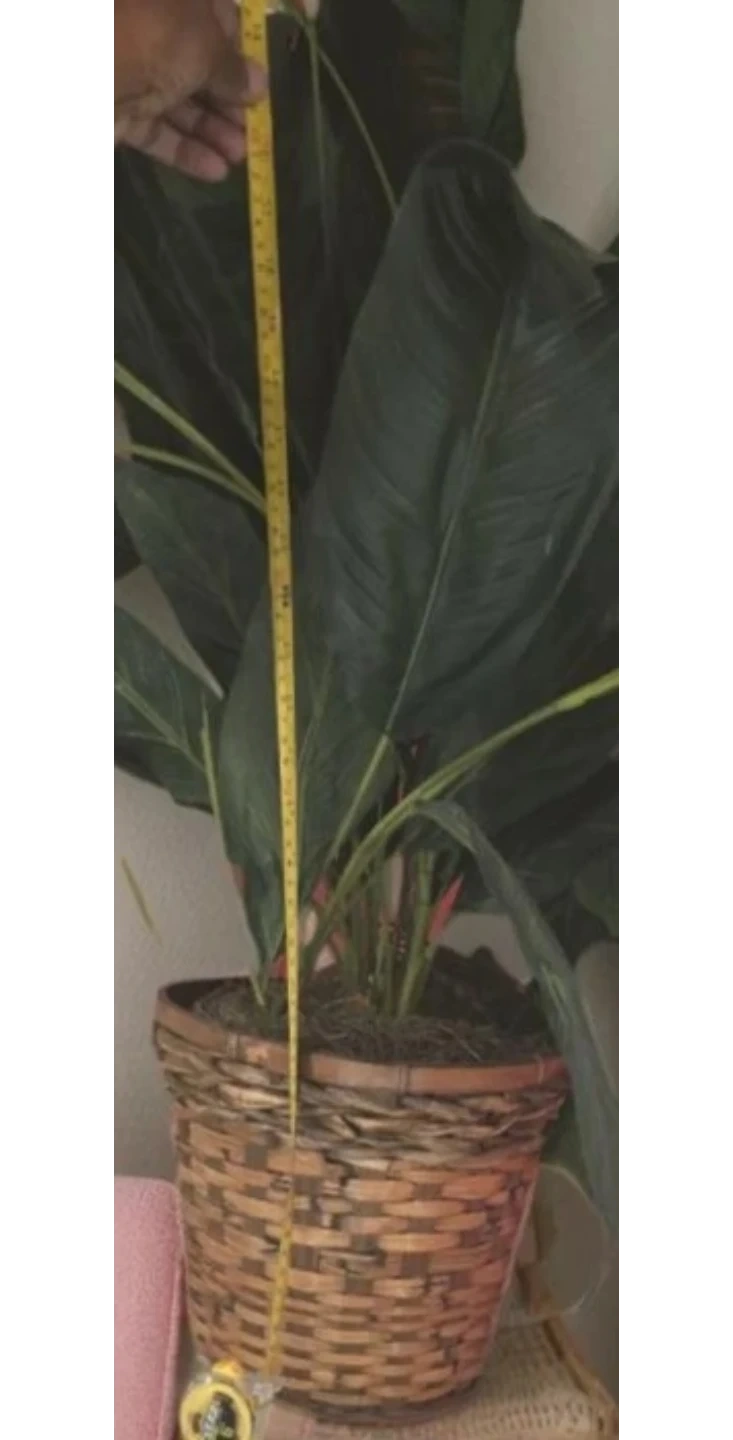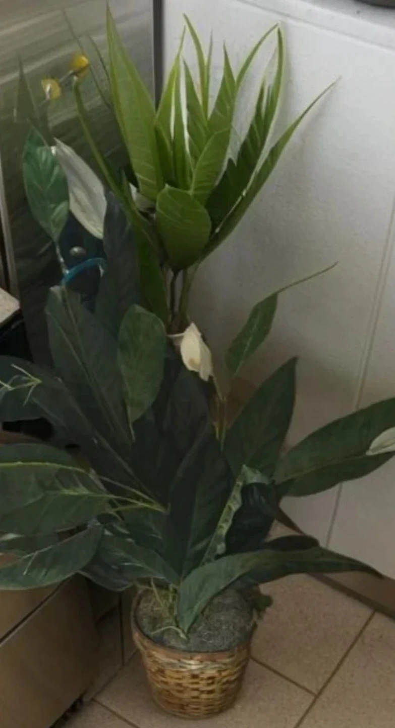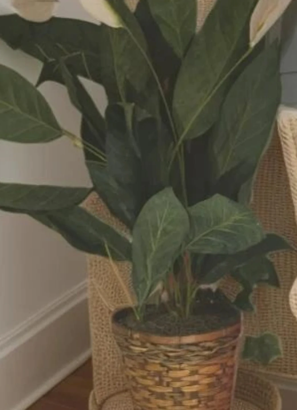 A lush tall artificial plant is presented in a woven wicker basket. This plant features dark green leaves and a white bloom. It's a low-maintenance decorative piece. As a tough of greenery to any corner