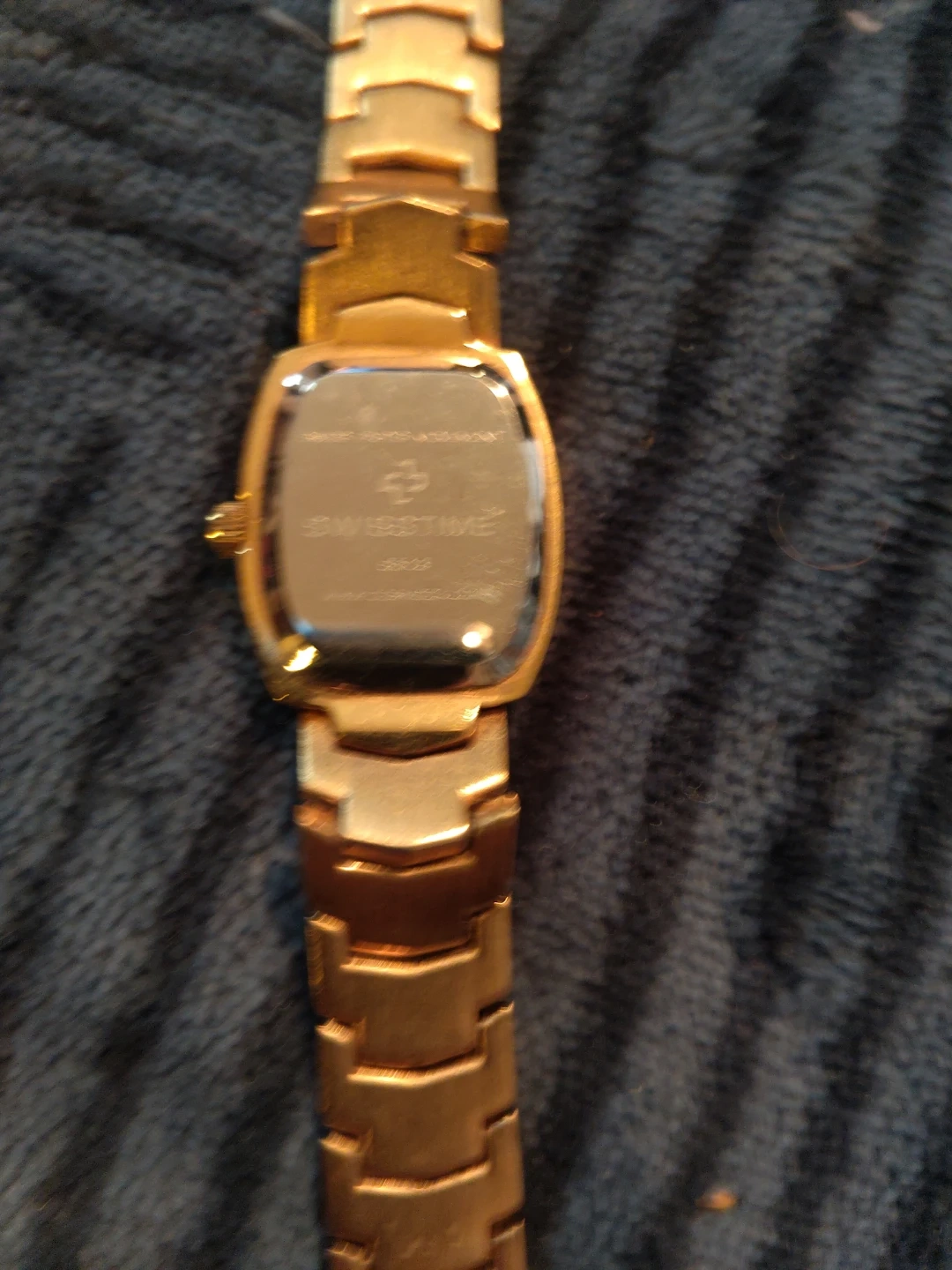 This is a women's gold tone Swiss Time watch. It's a classic accessory with a polished metal band. Water resistant.
