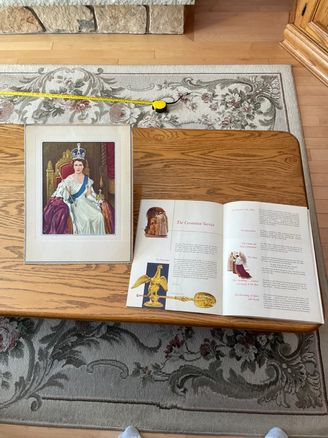 This item includes a program for The Coronation Service of Queen Elizabeth II, detailing 'The Preparative', 'The Recognition', 'The Litany and Holy Communion', 'The Anointing - Central Ceremony of the Rite', and 'The Presenting of Spurs and Sword'. It also features a portrait of Queen Elizabeth II in her coronation regalia. The program has text and illustrations of regalia. It's a historical collectible from the coronation period.