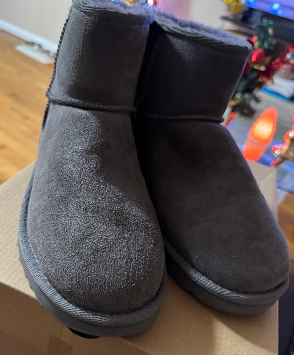 Selling a pair of UGG W Classic Mini II boots in grey, size 8. They are in great condition and come with the original box. These cozy boots are perfect for keeping your feet warm and stylish!