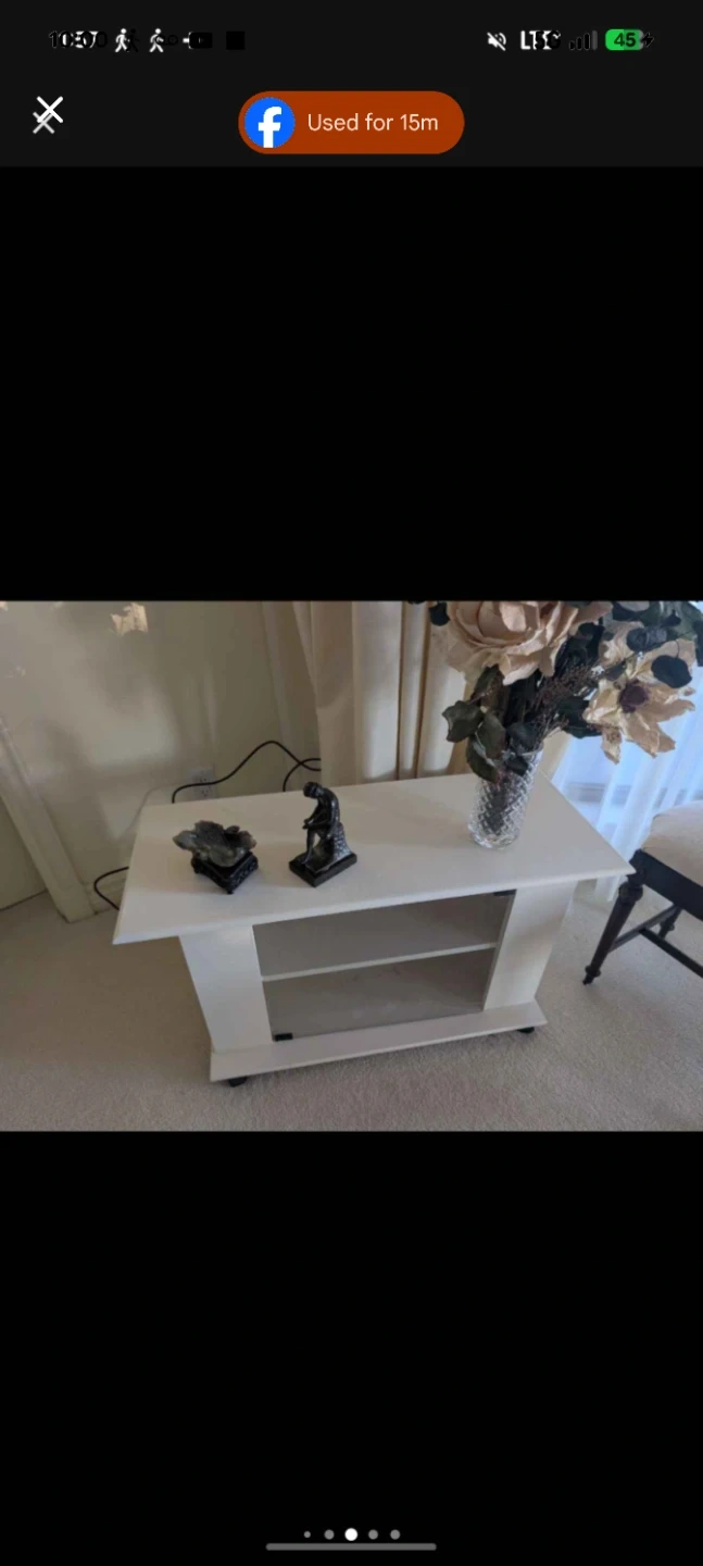 White coffee table with two open shelves. It's made of laminate or particle board. Measurements are approximately 40 inches wide, 20 inches deep, and 18 inches high. It's a functional piece for your living room!