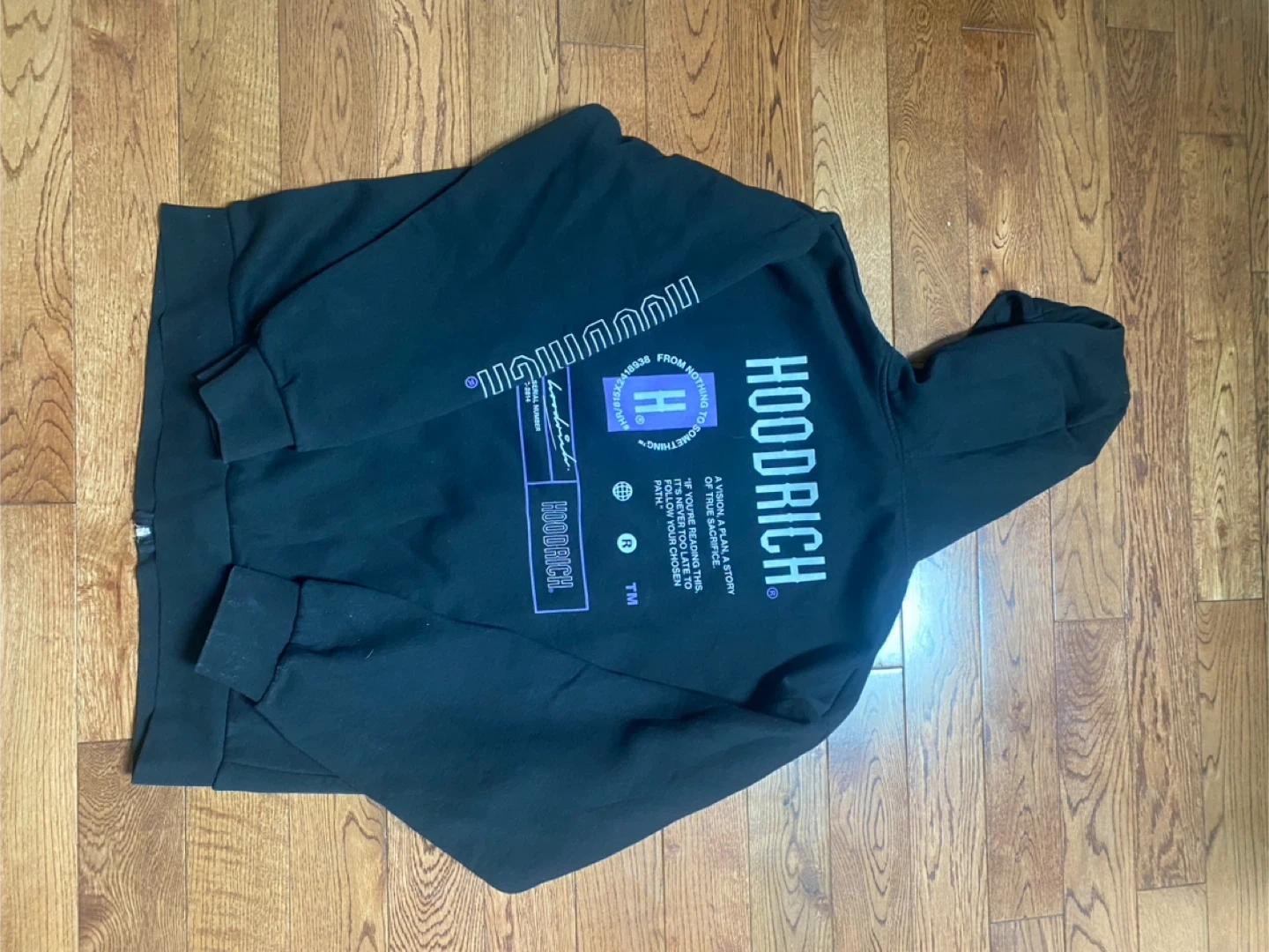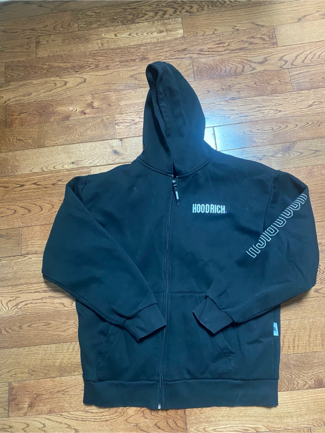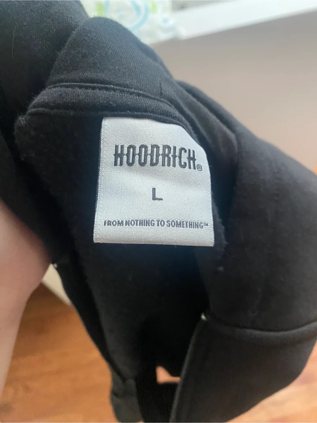 Black Hoodrich zip-up hoodie. Size is large. It's made of a soft material. Perfect for casual wear!