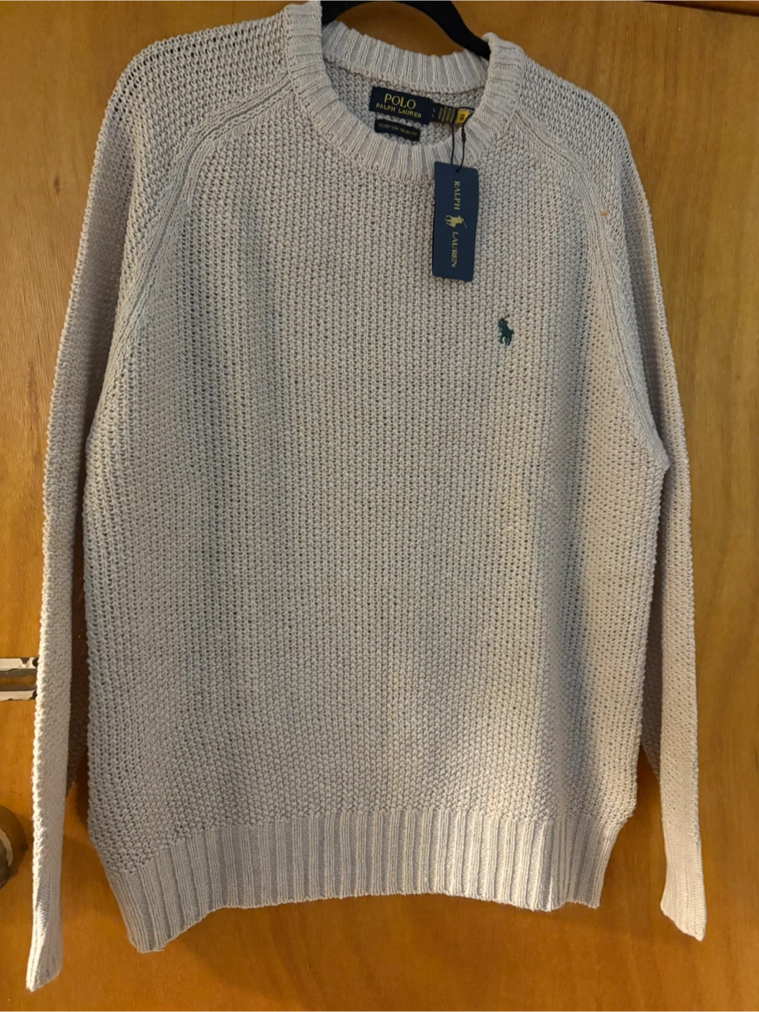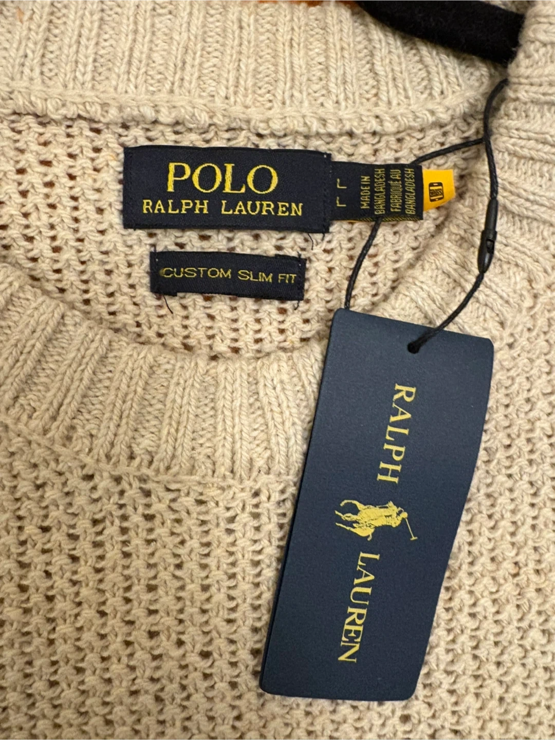 This is a Polo Ralph Lauren men's crew neck sweater. It's a size Large and features a custom slim fit. The material is a knit fabric.