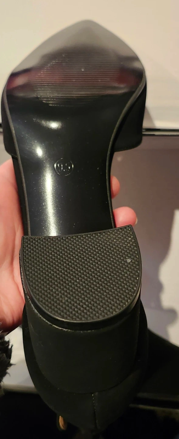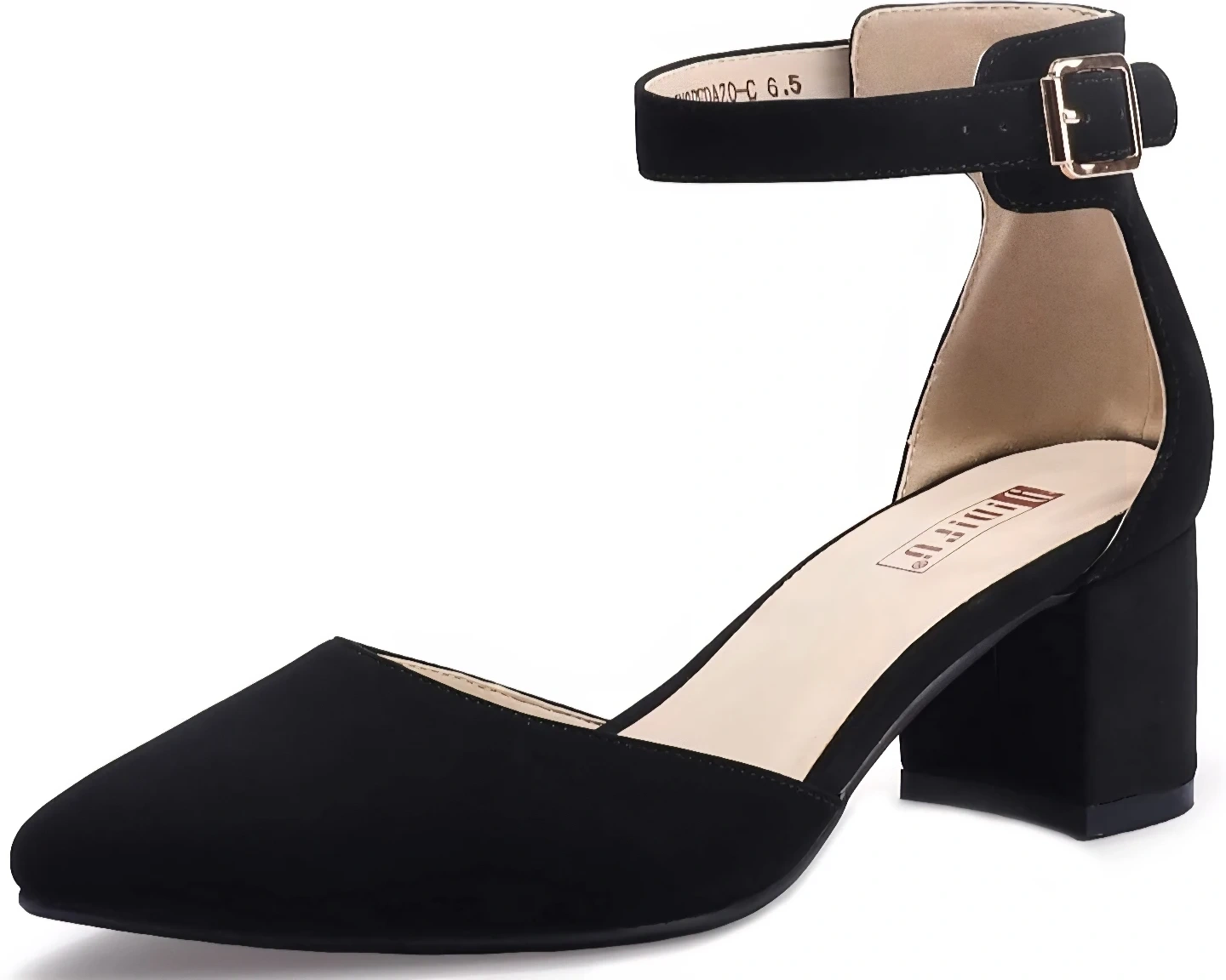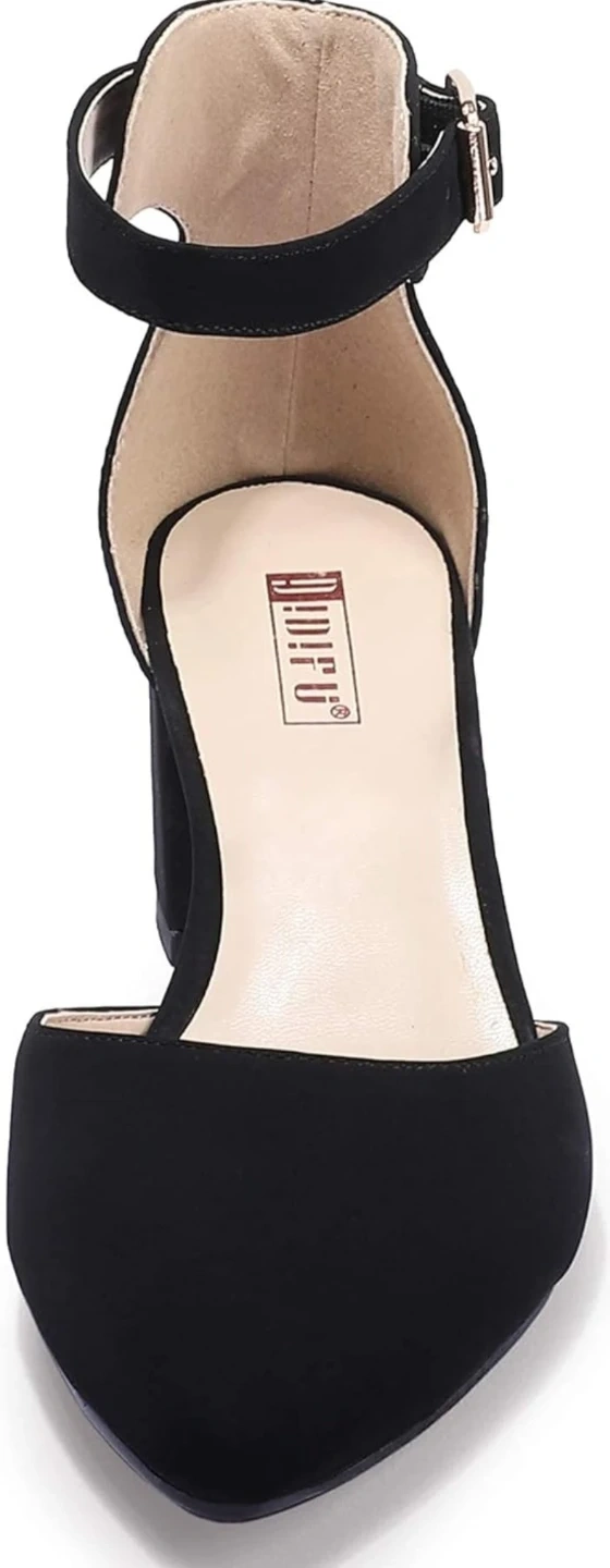 These black block heel shoes feature a stylish ankle strap and pointed toe. They're made with a comfortable faux suede material. Comes with original box.