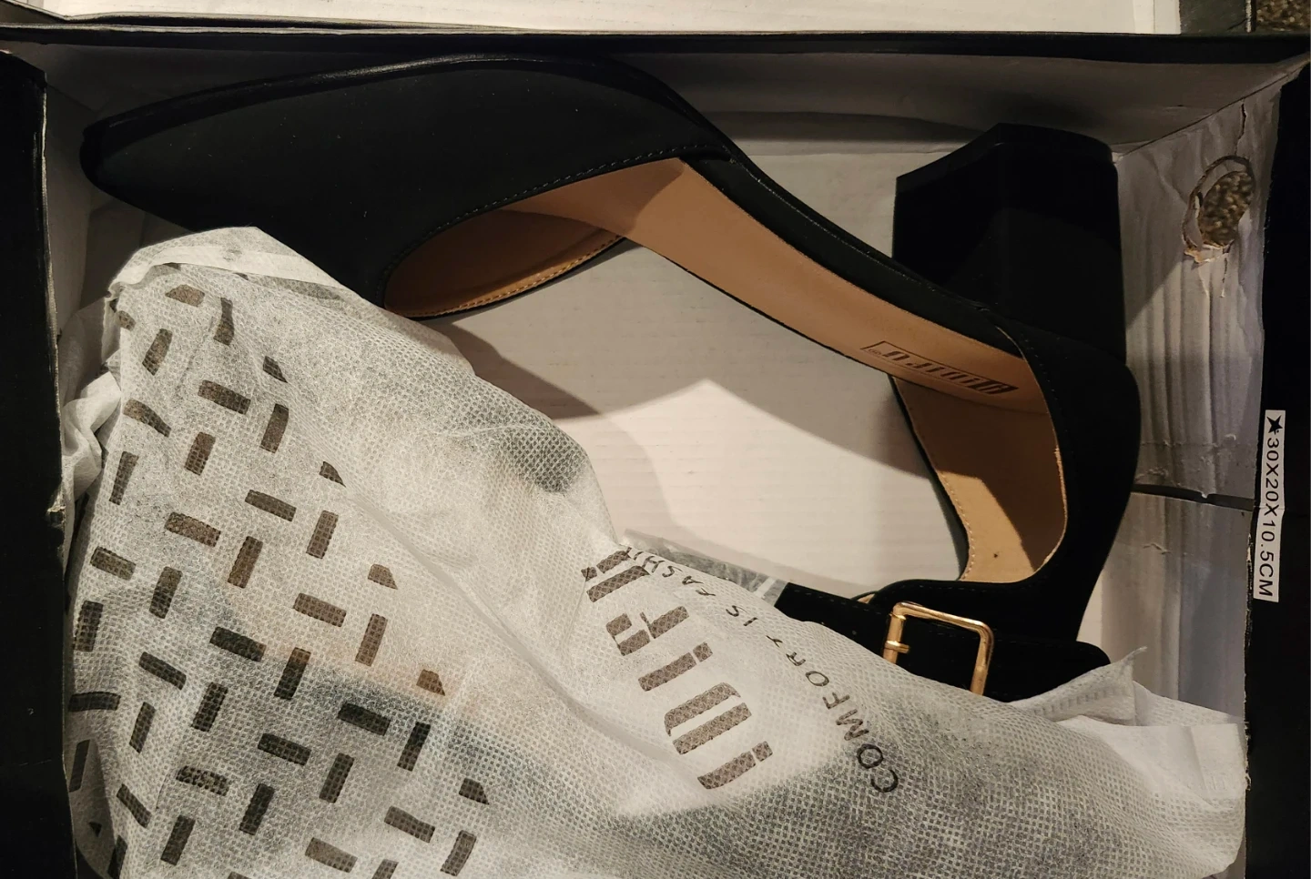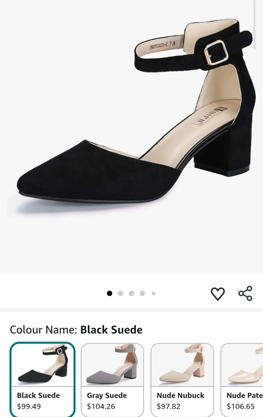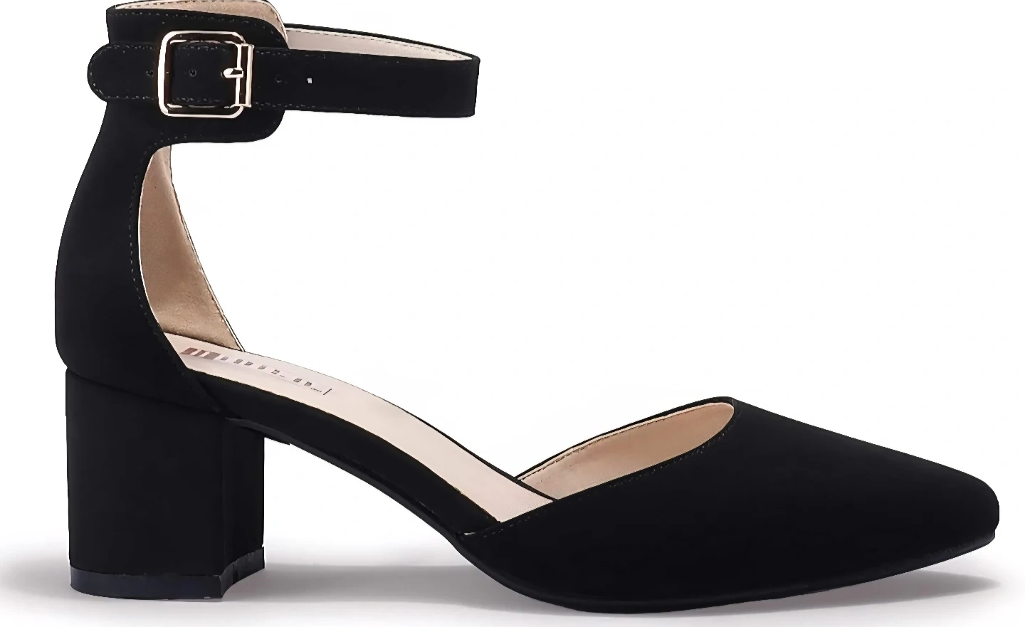 These black block heel shoes feature a stylish ankle strap and pointed toe. They're made with a comfortable faux suede material. Comes with original box.