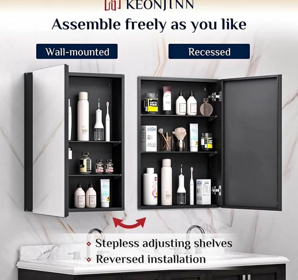 Modern black mirrored medicine cabinet for your bathroom. Features tempered glass with adjustable shelves for flexible storage. This cabinet is lightweight and can be wall-mounted or recessed. Stylish and practical for any bathroom setup. Size: 76 × 66 cm. Black mirrored finish. Tempered glass. Adjustable shelves. Lightweight and durable. Wall mount.