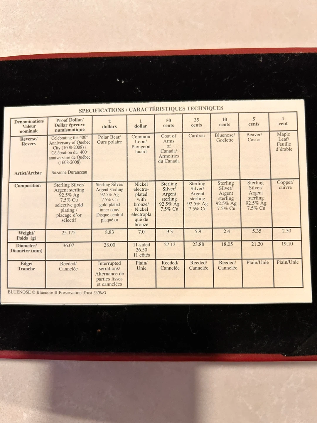 This is the 2008 Proof Set of Canadian Coinage. Collectors Item, every coin is in mint condition except for the proof dollar, which has very minimal rusting on it. The plastic case has never been opened.