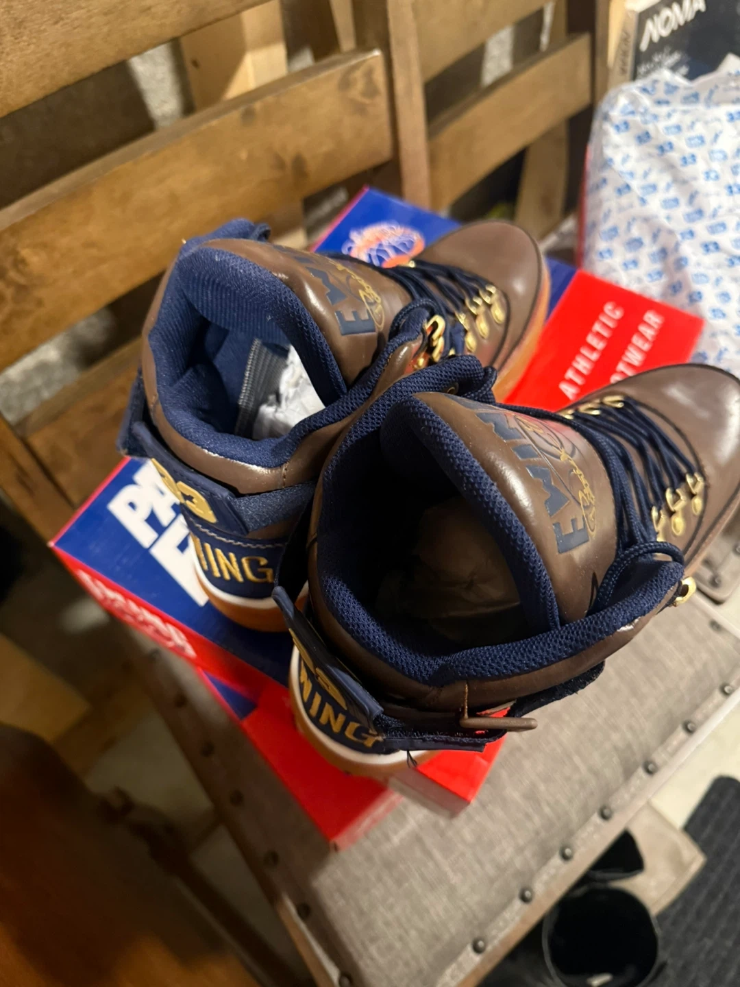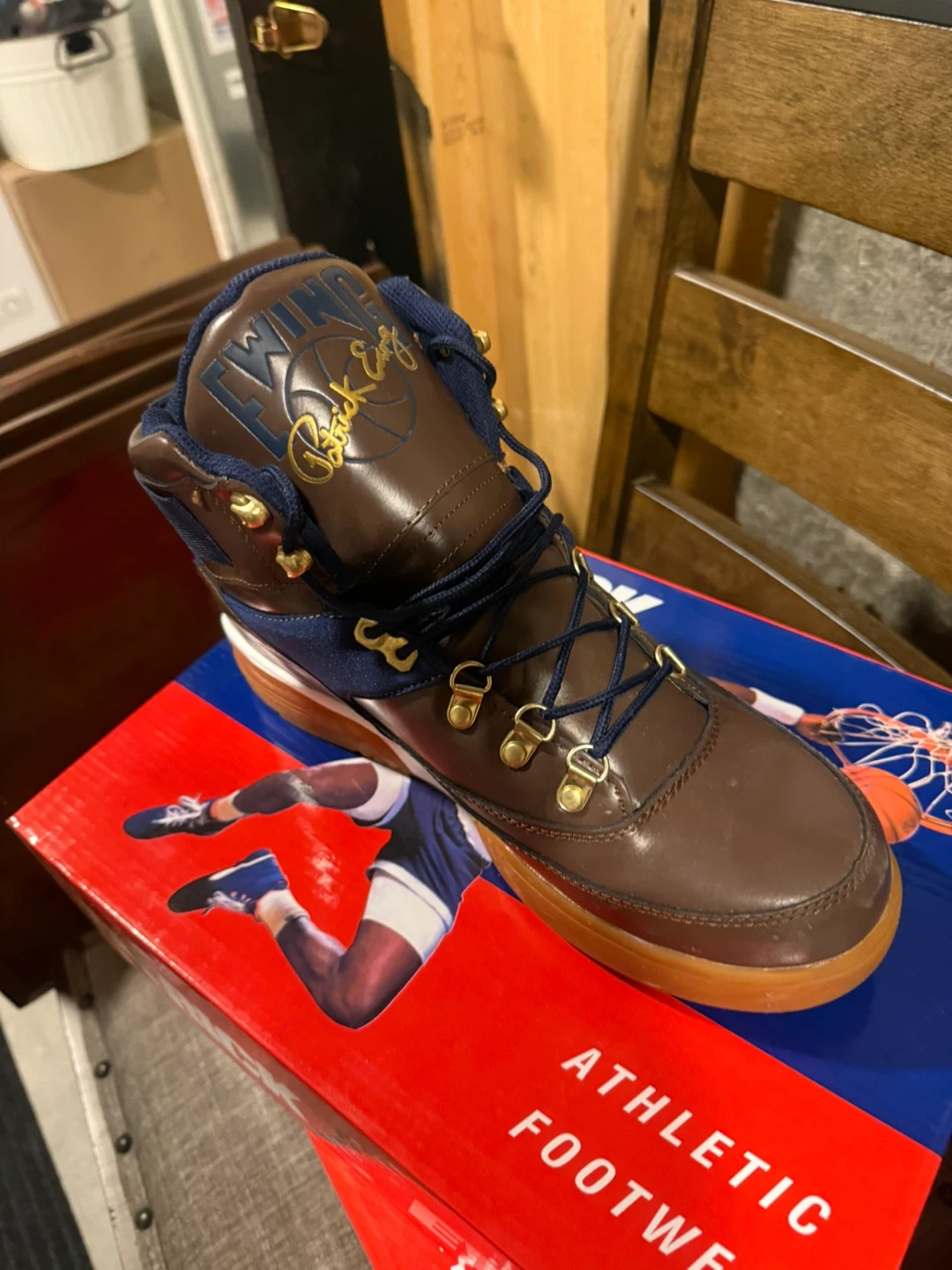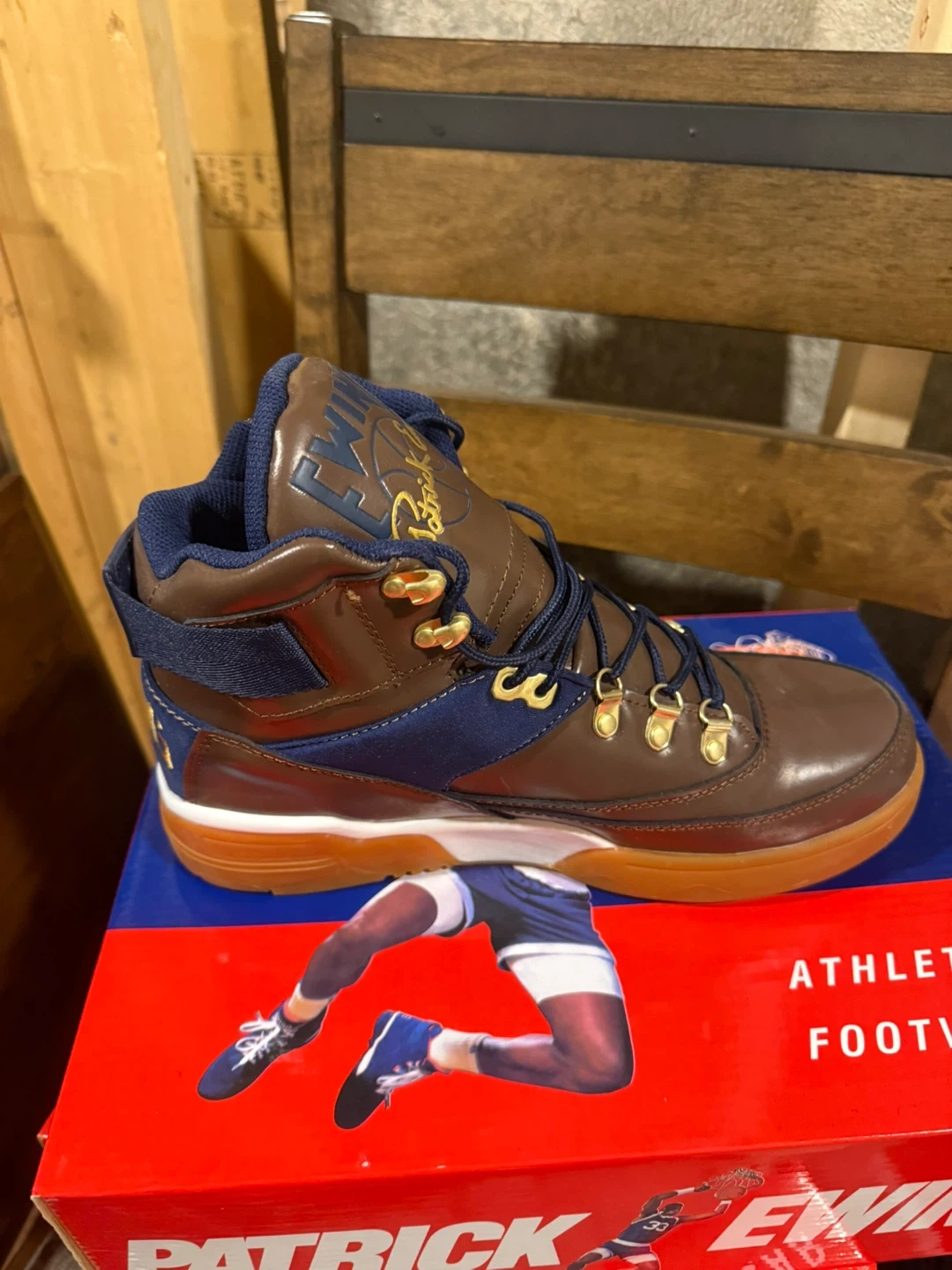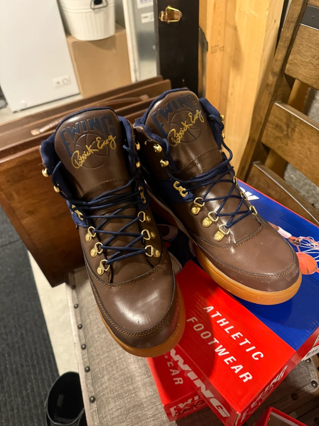 These brown leather athletic footwear are by Patrick Ewing. They're a high-top style with gold hardware and navy accents. The soles are gum rubber. Winter Ewings size 10 wore one time only