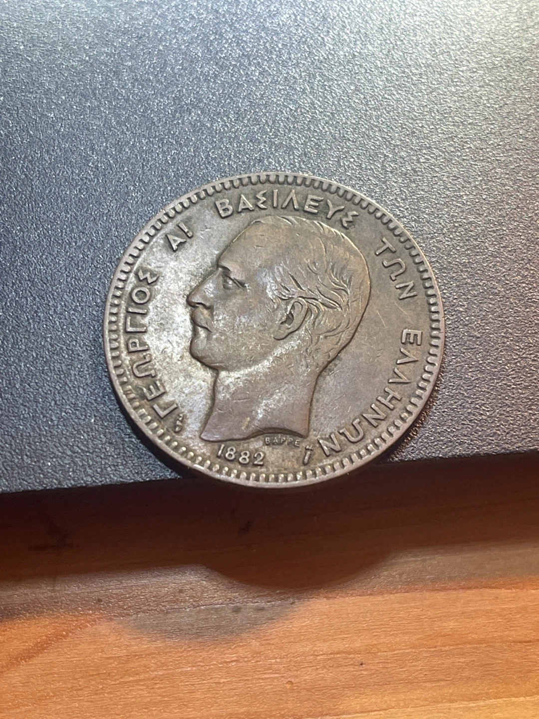 This is a Greek 10 Lepta coin from 1882. The coin features a portrait of a man on one side and a laurel wreath with the denomination on the other. It's a collector's item for numismatists interested in historical currency.