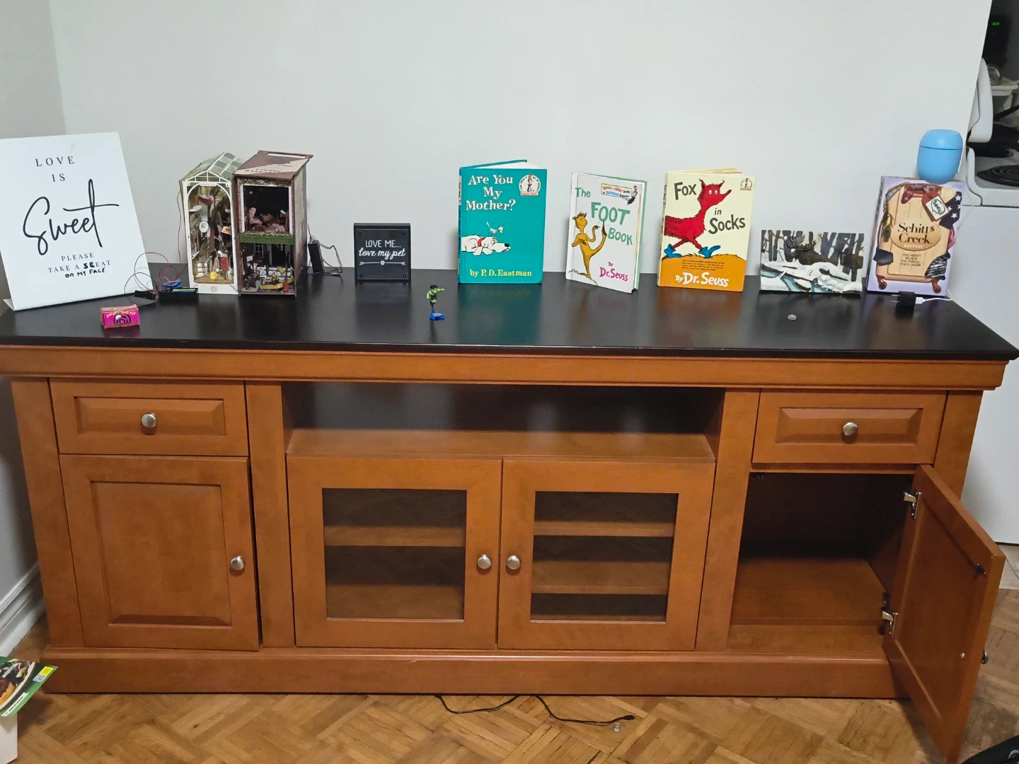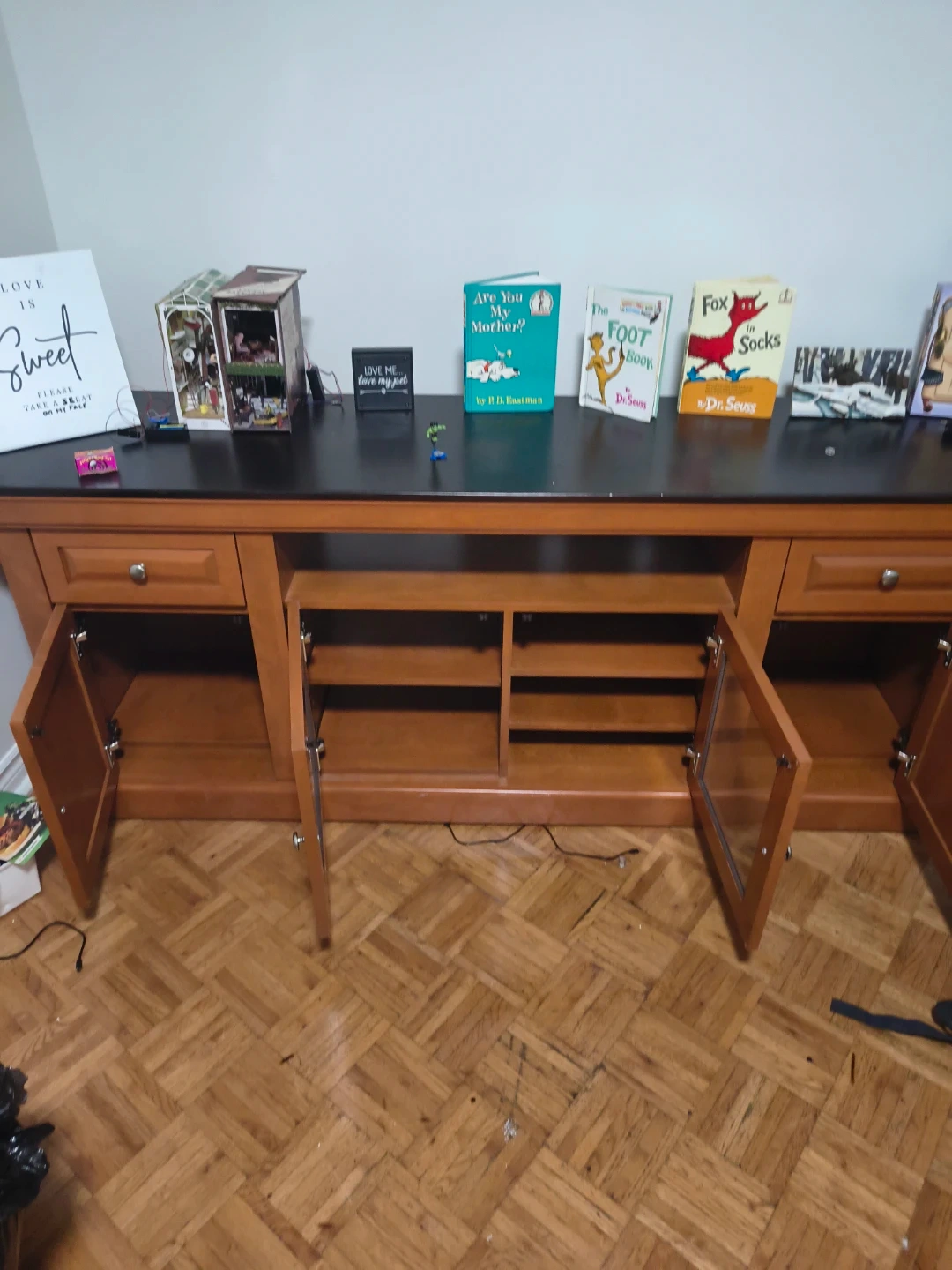 Selling a used wooden TV stand, perfect for adding storage and style to your living room! It features drawers, cabinets with glass doors, and open shelving. Great for organizing media consoles, books, and decor, it's a versatile piece for any home has one or two visible scratches but is brand new bought it for my apartment last week took the shrink wrap off myself.