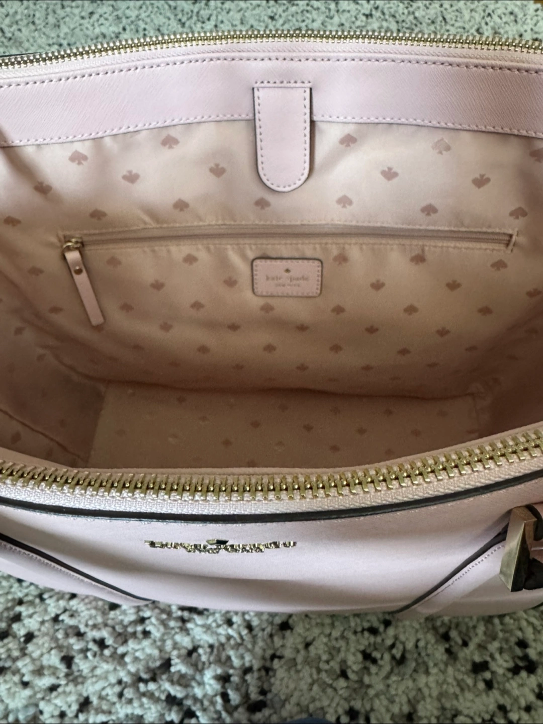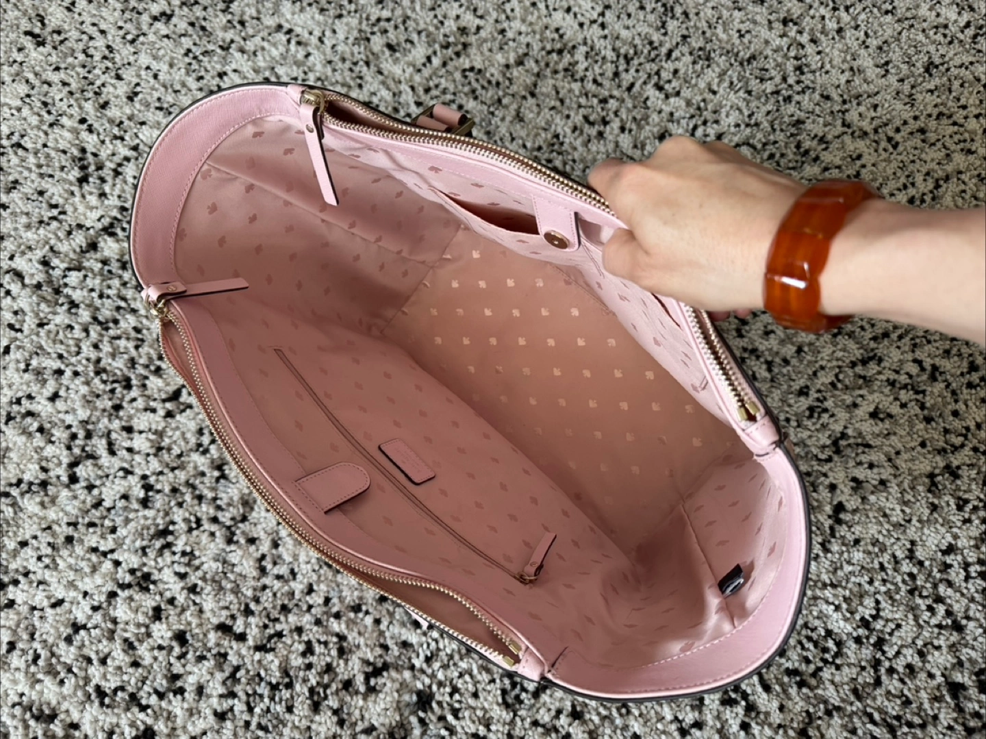 Large pink tote bag. Saffiano leather. No scratches, new. Top zip closure. Interior zip pocket and slip pocket. Double top handles. Excellent condition. It was a present but it is not really my style. Never used. Original price is almost $600