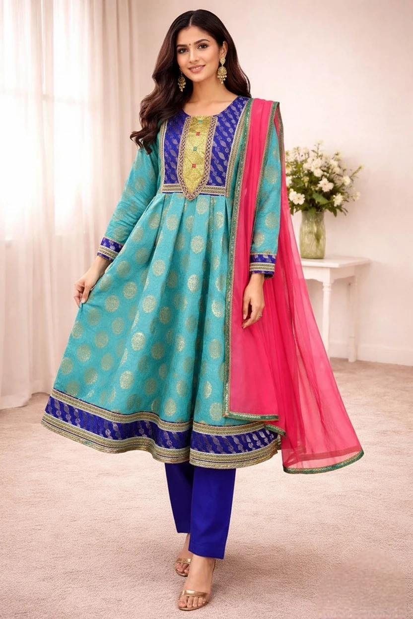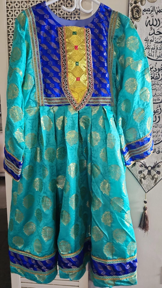 Selling a beautiful Afghan women's traditional dress. It features a vibrant combination of turquoise, blue, and gold colours. The dress is intricately designed with traditional patterns and detailing, perfect for cultural events or special occasions