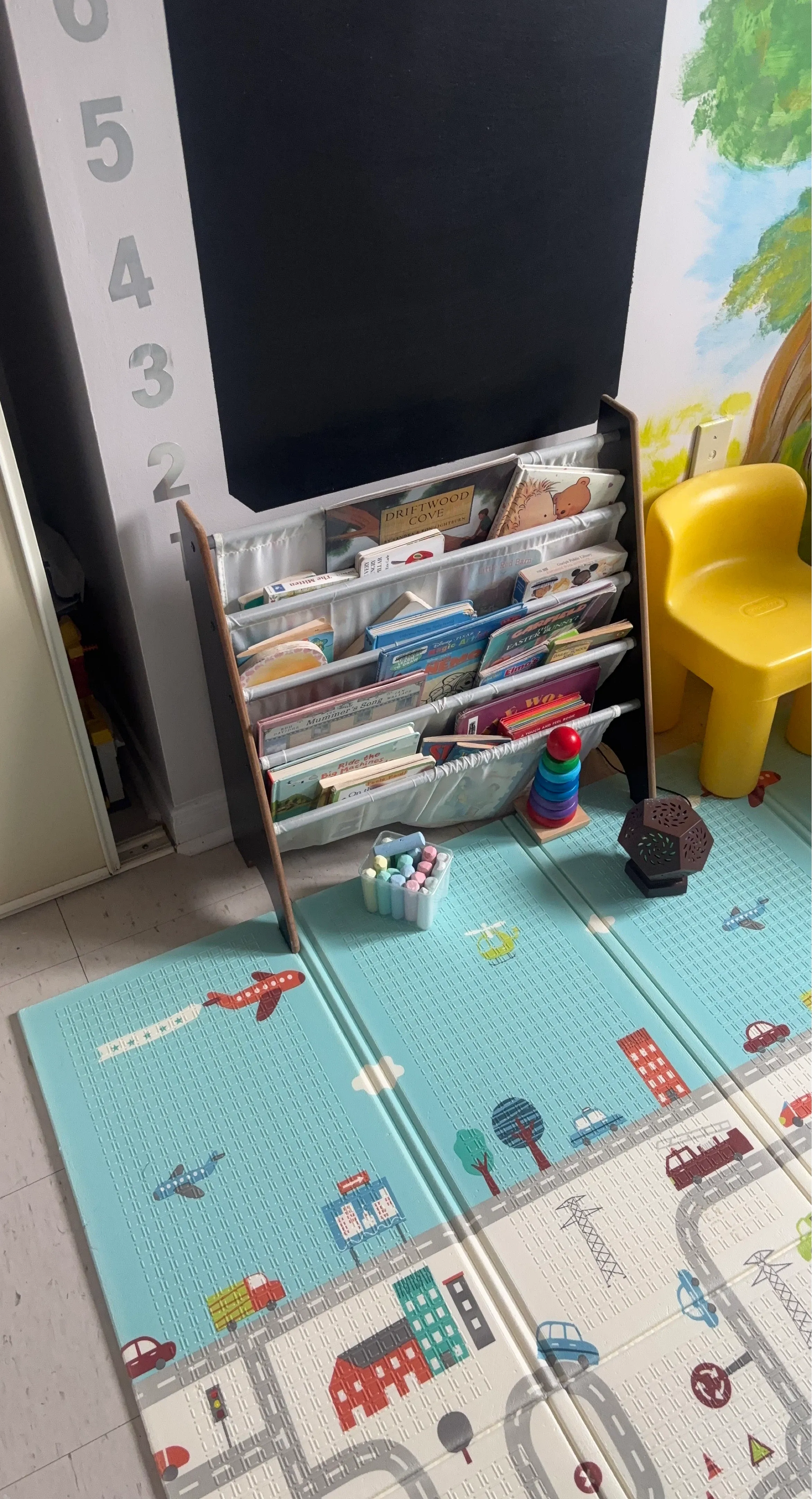 This is a multi-tiered book shelf perfect for organizing children's books. It's made of wood and fabric. Includes several children's books like 'The Mitten' and 'Mummer's Song'. Great for a playroom!