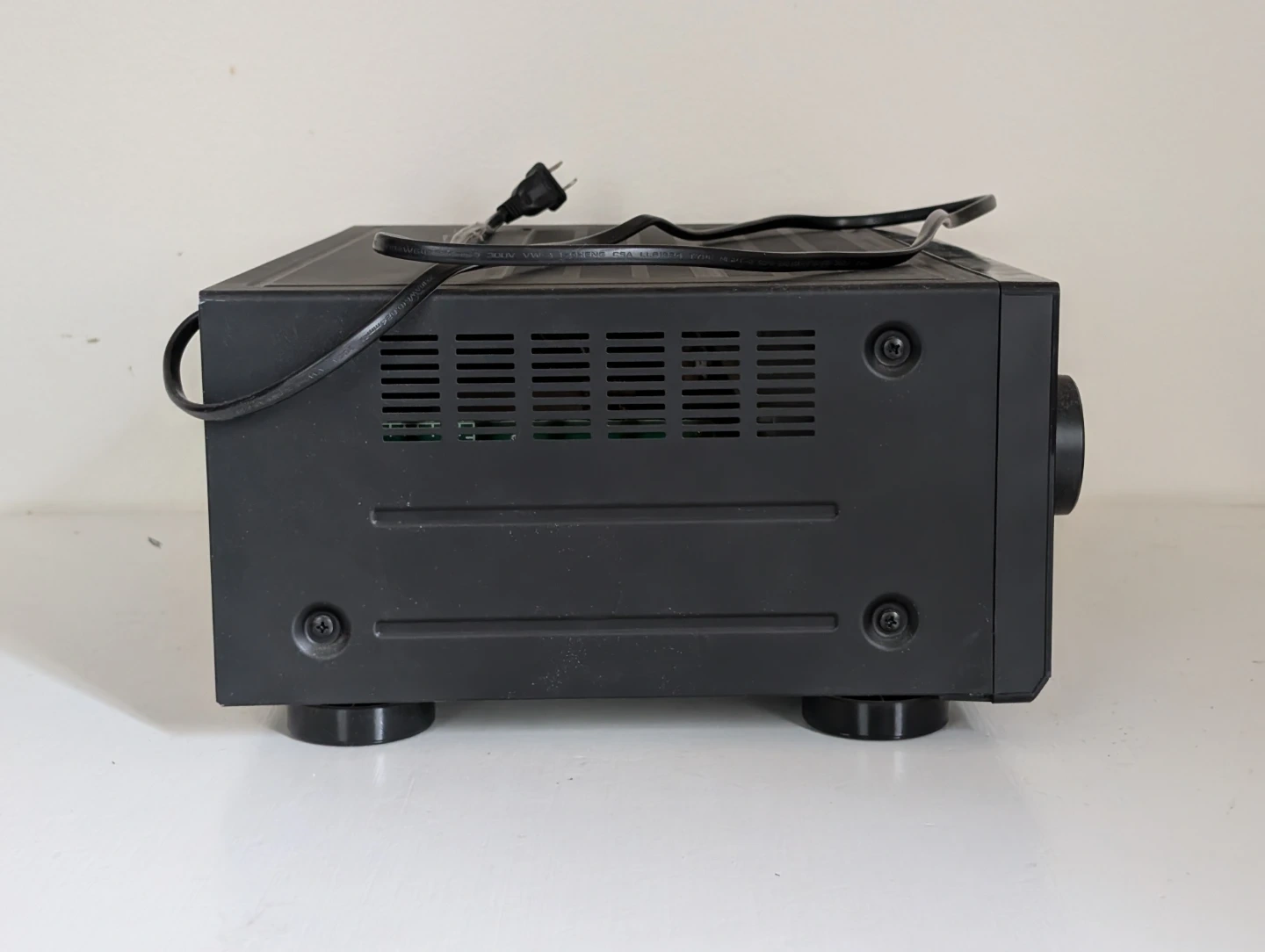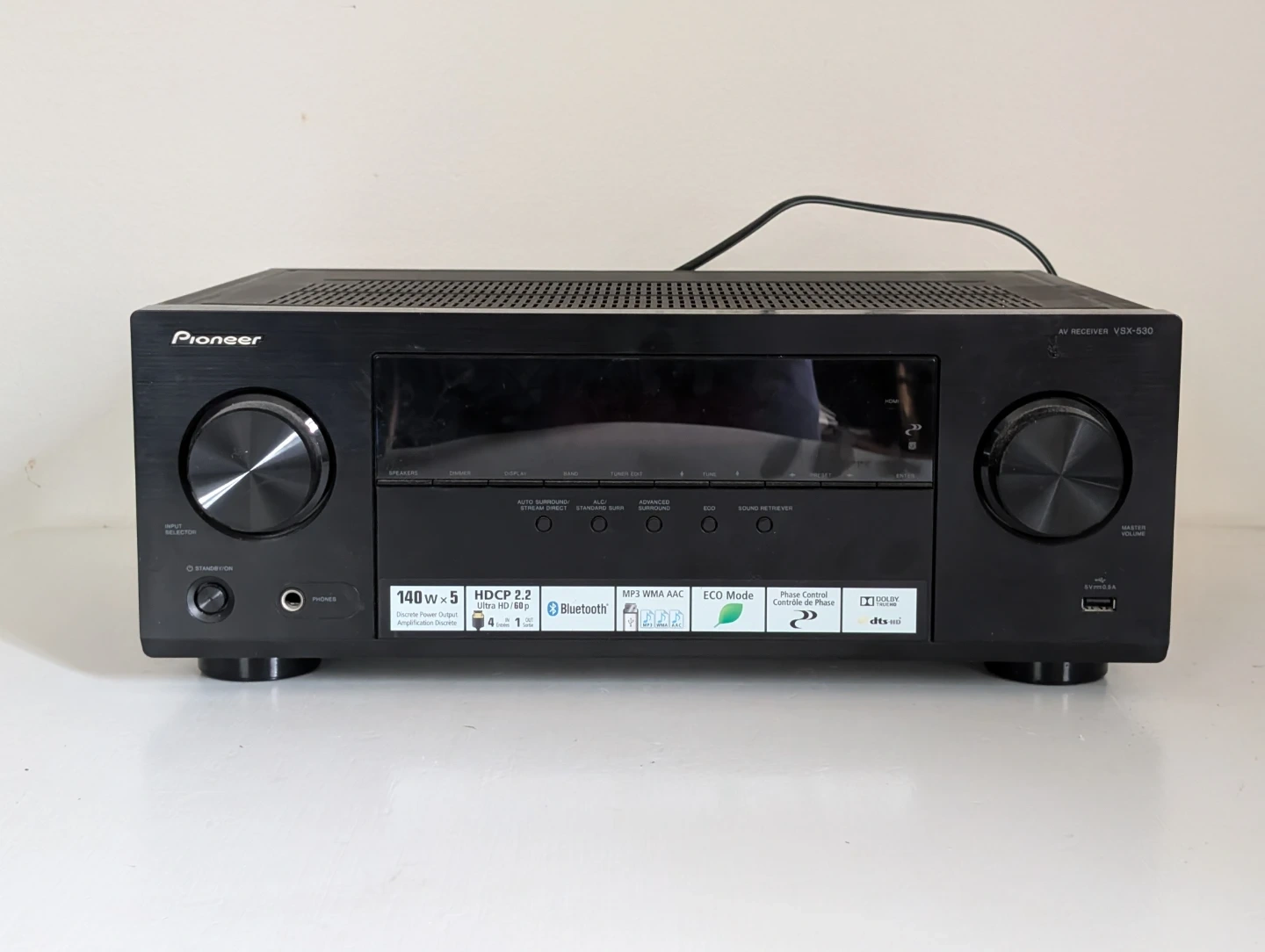 Pioneer VSX-530 AV receiver and remote control included. It's black and supports 140W x 5 discrete amplification. It also has HDCP 2.2, Bluetooth, MP3 WMA AAC, and ECO Mode. This receiver is great for setting up a home theatre system.