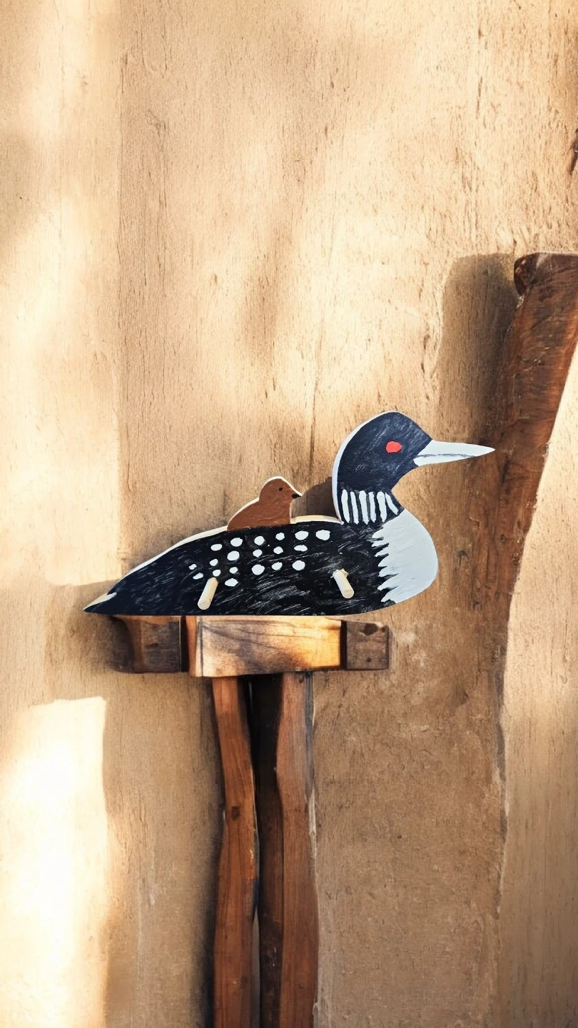 Key Holder A charming wooden decoration featuring a loon with a baby bird on its back. It's painted with black, white, and grey details and has red eyes. This piece would make a lovely addition to a cabin or cottage decor.