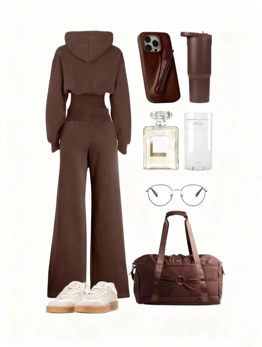 New 2pcs Brown Set Hooded Sweatshirt and Wide Leg Sweatpants