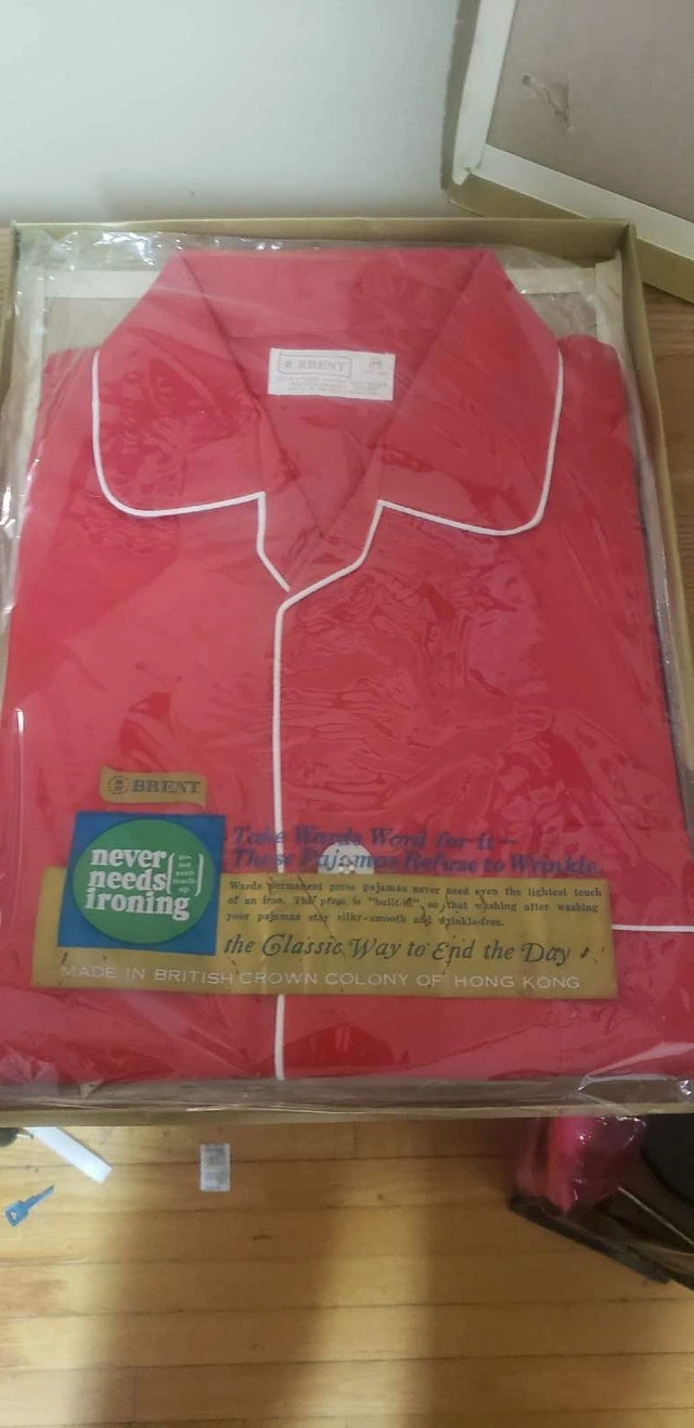 NEW VINTAGE BRENT RED PJ PAJAMAS. Size M 37-40 WARDS PERMANENT PRESS PAJAMAS NEVER NEEDS EVEN THE LIGHTEST TOUCH OF AN IRON. THE PRESS IS BUILT IN SO THAT WASHING AFTER WASHING YOUR PJ STAY SILKY SMOOTH AND WRINKLE FREE MADE IN BRITISH CROWN COLONY OF HONG KONG.. ASKING $40 PICK UP ON BEAVERBROOK LANE IN KANATA THANK YOU