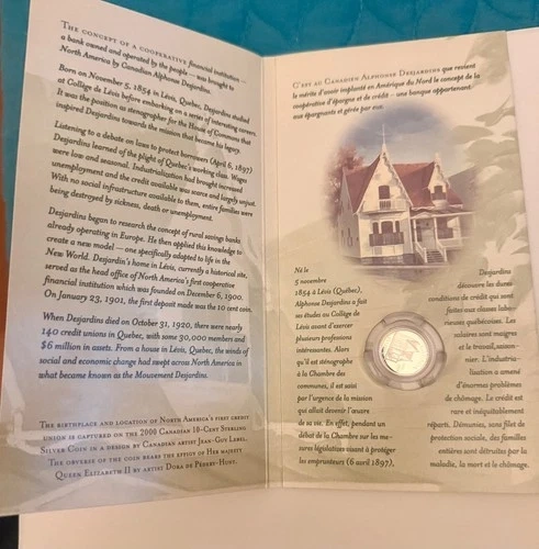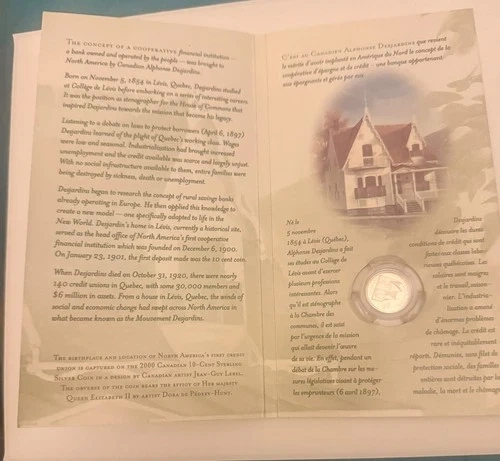 This is a 2000 Canada 10-Cent Sterling Silver commemorative coin issued by the Royal Canadian Mint for the 100th Anniversary of Credit Unions in North America, associated with Alphonse Desjardins. The coin is 92.5 percent sterling silver and remains in its original Royal Canadian Mint cardboard presentation, exactly as issued. It has never been removed from the holder and has been stored carefully since purchase. The presentation includes the original bilingual informational booklet. All original components shown in the photos are included. Some light glare may be visible in photos due to the coin’s proof style and protective casing; this is normal for reflective silver coins and does not affect the condition.