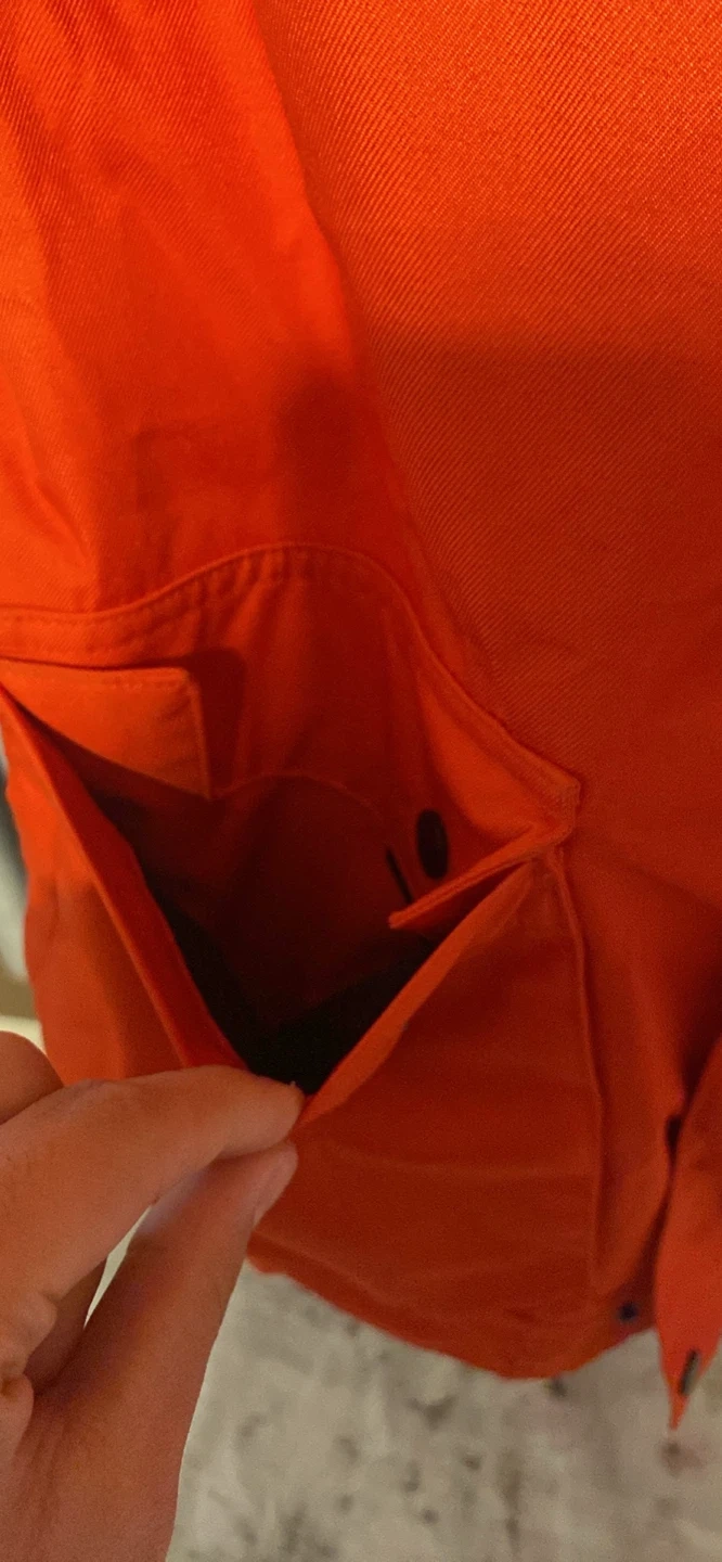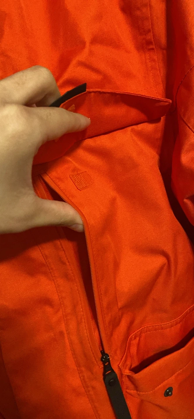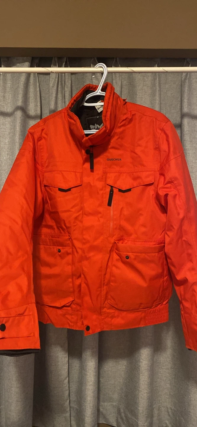 Bright orange QUECHUA jacket here! Has cool pockets with flaps and zippers. Super comfy for outdoor stuff, ski trips, or just staying warm.