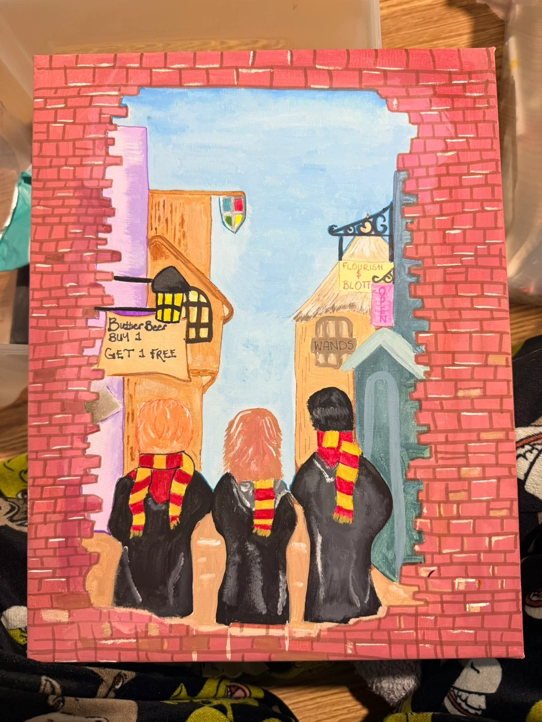 Selling a cute painting of Harry Potter, Ron, and Hermione in Diagon Alley! It's a colourful piece that would look great in any room. The painting features the iconic Flourish and Blotts bookshop and the Leaky Cauldron pub