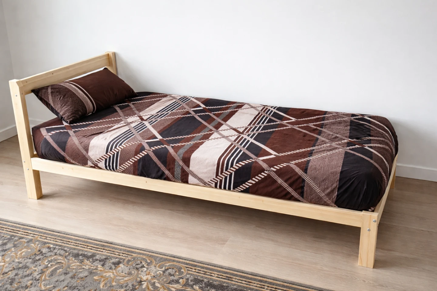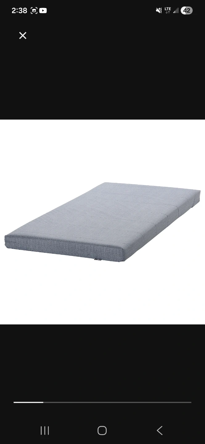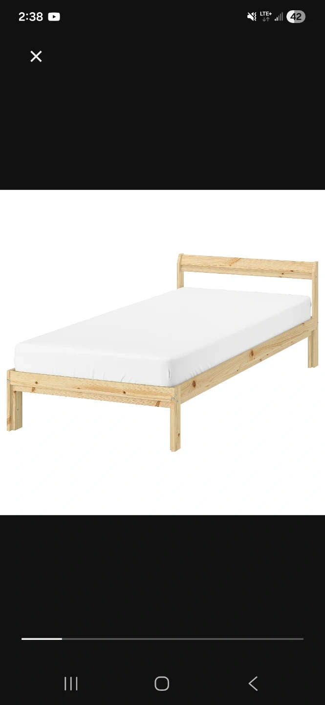 This is an IKEA twin bed frame, made of wood. It measures 195 cm long and 101 cm wide. It comes with a grey IKEA mattress that's 189 cm by 97 cm and 10 cm thick. This set is great for a child's room or a guest bedroom!