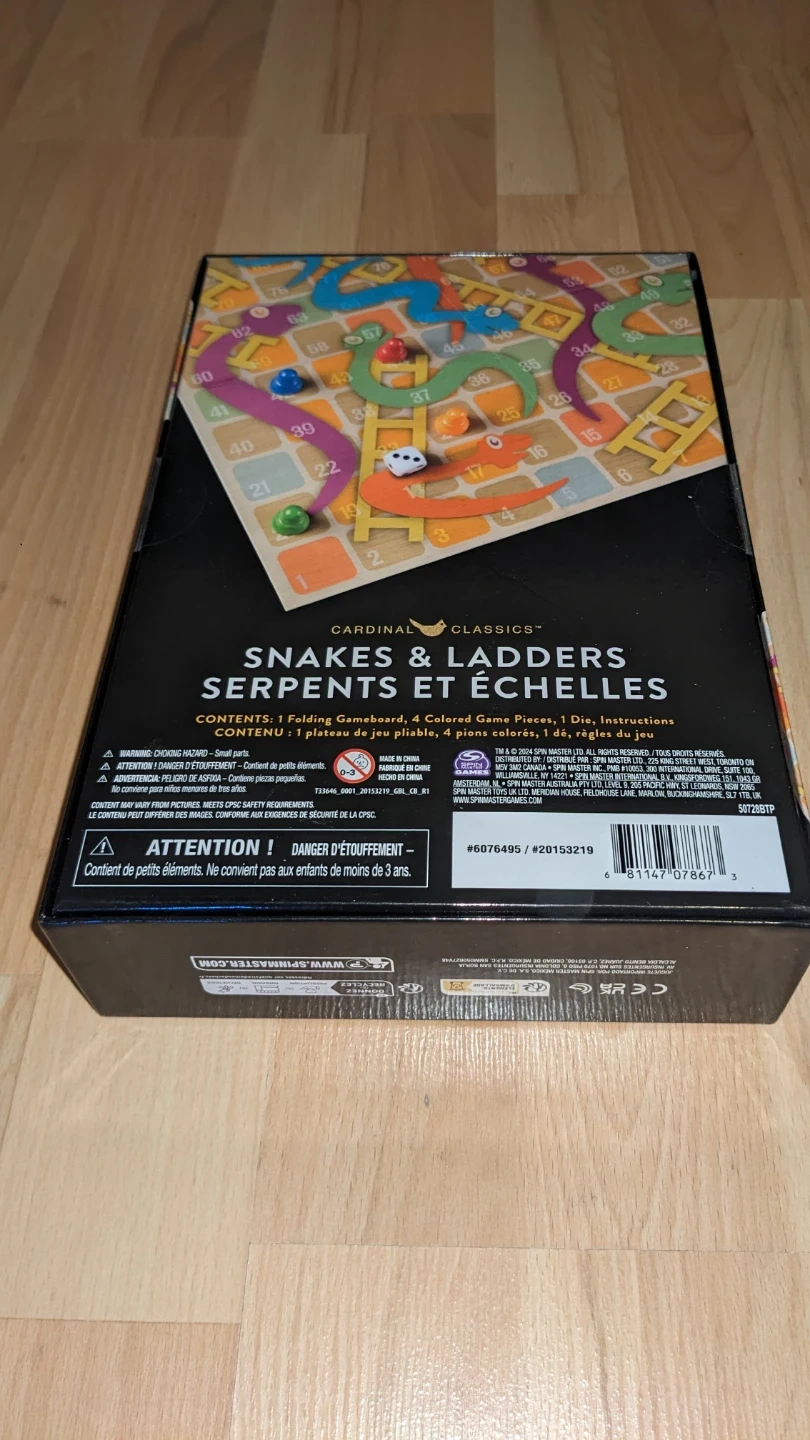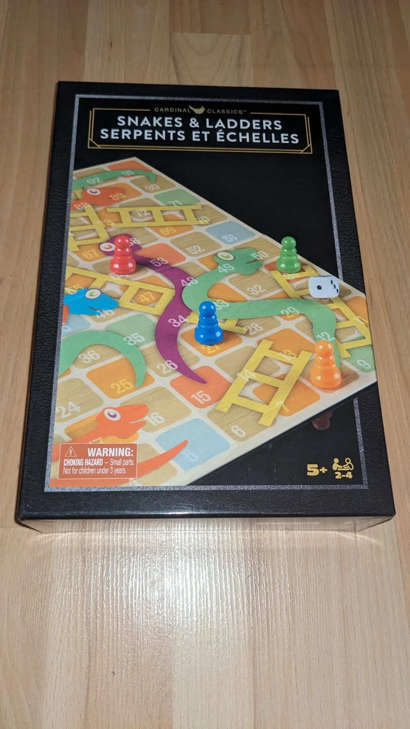 This Cardinal Classics Snakes & Ladders game is perfect for family game nights. It includes a folding gameboard, four coloured game pieces, one die, and rules. Designed for 2-4 players, it's recommended for ages 5 and up.