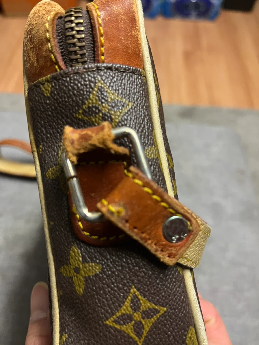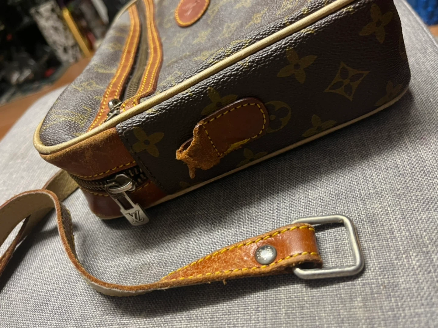 Crossbody strap on left side is ripped.