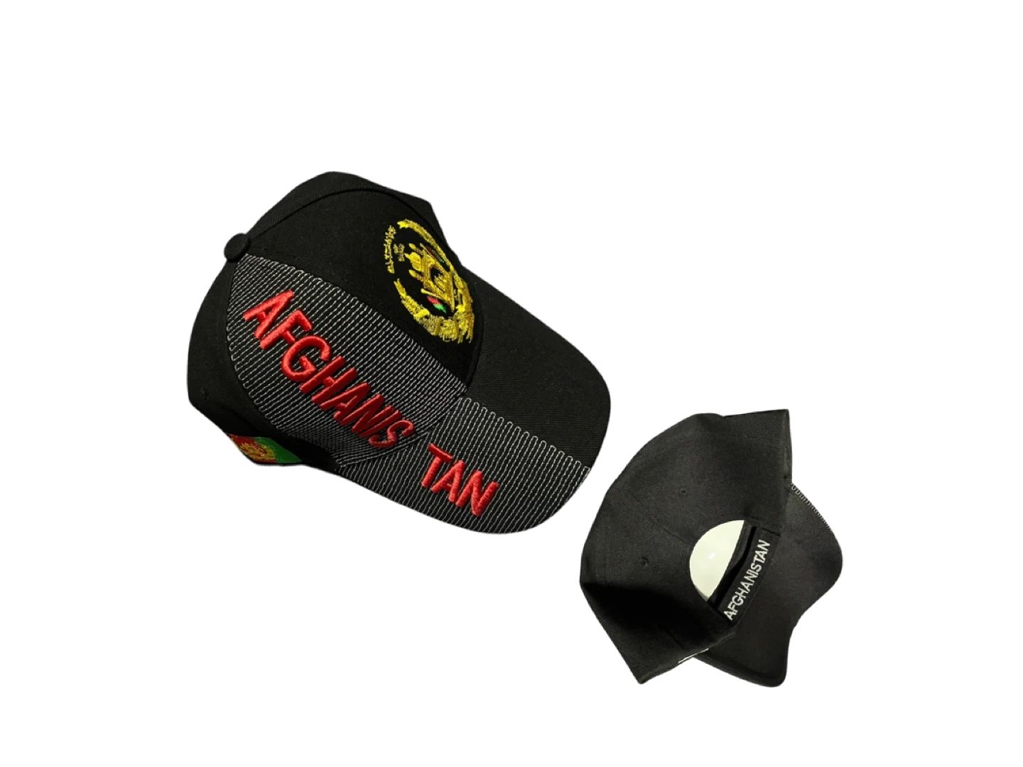 Black baseball cap with red embroidery spelling "AFGHANISTAN" across the front. Features a flag patch on the side. One size fits most. Perfect for showing national pride!