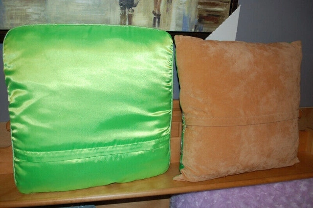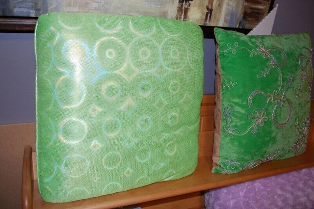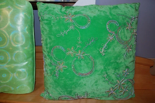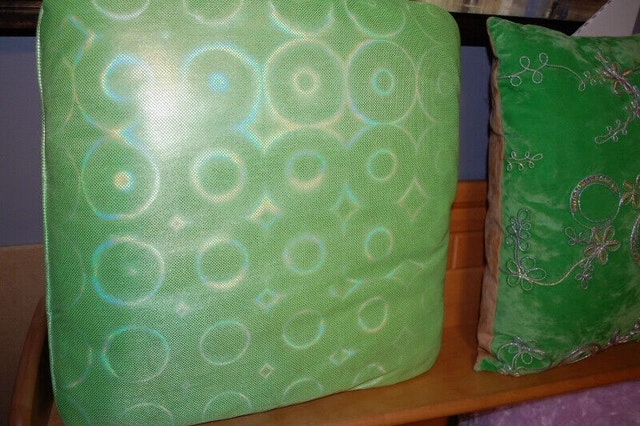 Vibrant green color throw pillows. One is velvet with gold and silver thread embroidery and beige velvet reverse. The other has 3-D effects in a smooth silk-like fabric. Both are like new condition. Used for guest room decor. Asking $20 each or best offer. Removable covers. Pick up near Britannia Rd and Ninth Line.