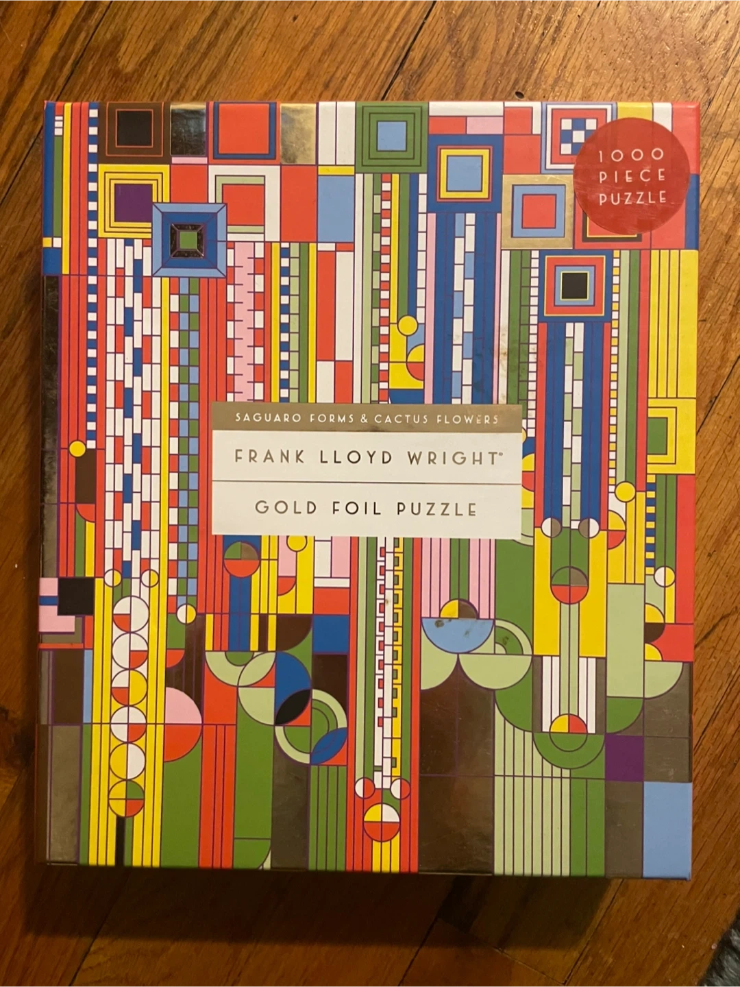 This is a 1000 piece gold foil puzzle featuring Frank Lloyd Wright's Saguaro Forms & Cactus Flowers design. It's a unique puzzle for art and architecture enthusiasts. The puzzle is made with high-quality materials for a satisfying build experience! Never opened.
