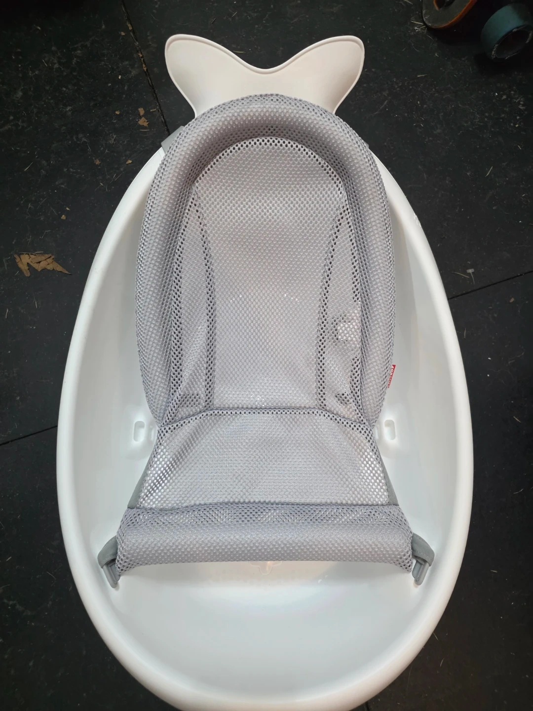 This white baby bath tub comes with a grey mesh sling for extra support. It's designed for newborns and up, making bath time easier. The sling is cradling and comfortable for little ones.