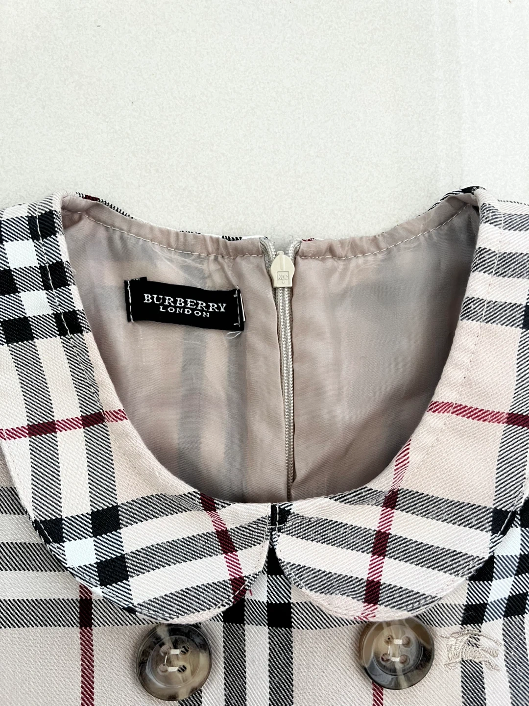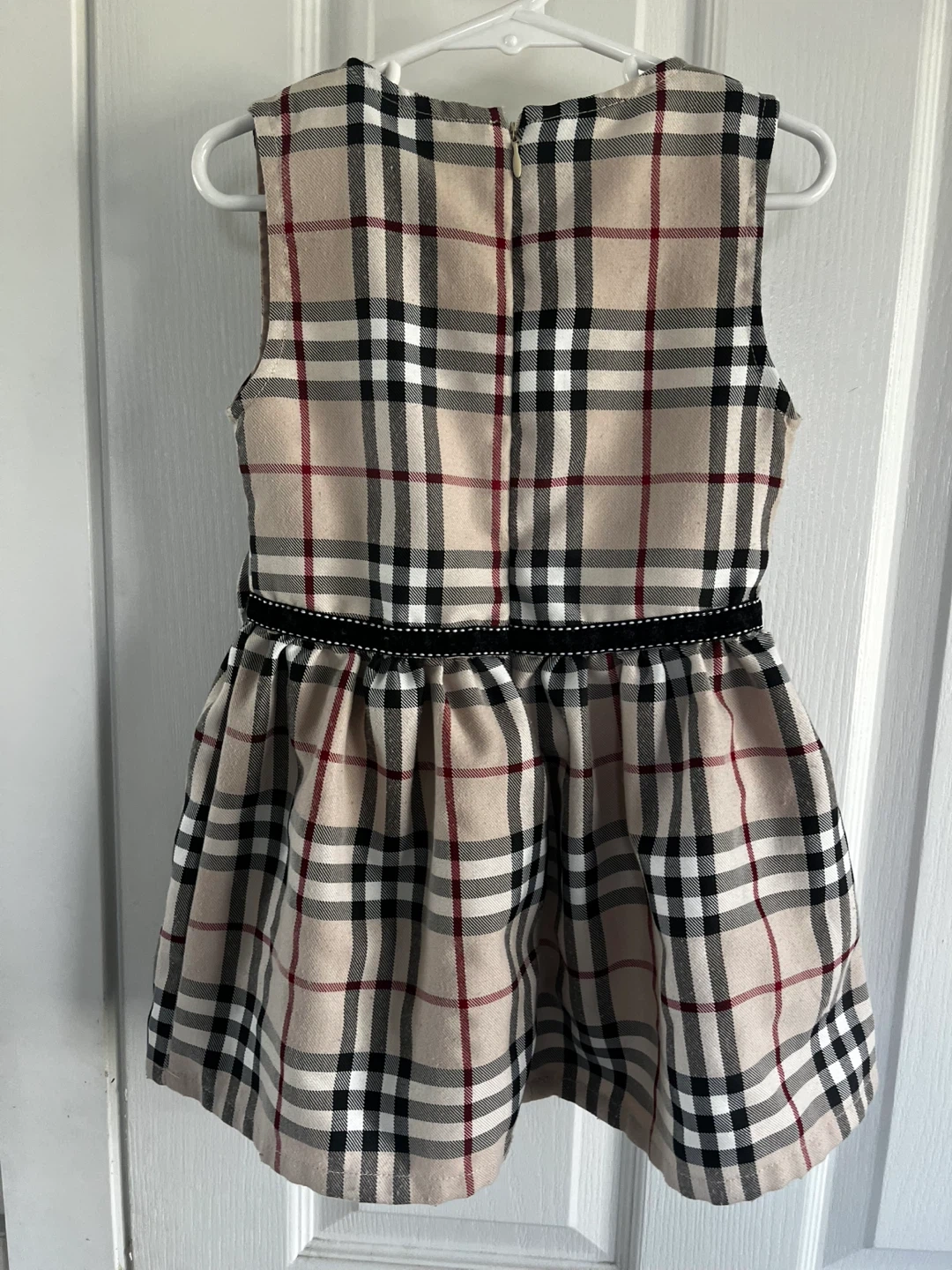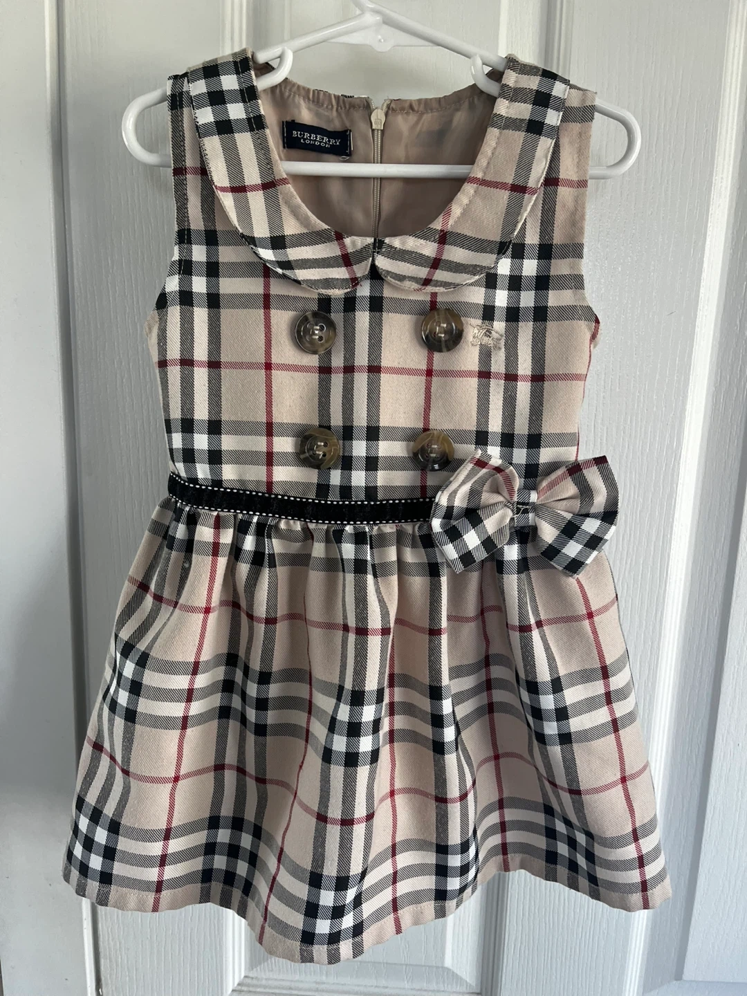Burberry London sleeveless dress in classic tartan pattern. Features a Peter Pan collar, double-breasted button detail, and a matching bow accent at the waist. Zipper closure at the back.