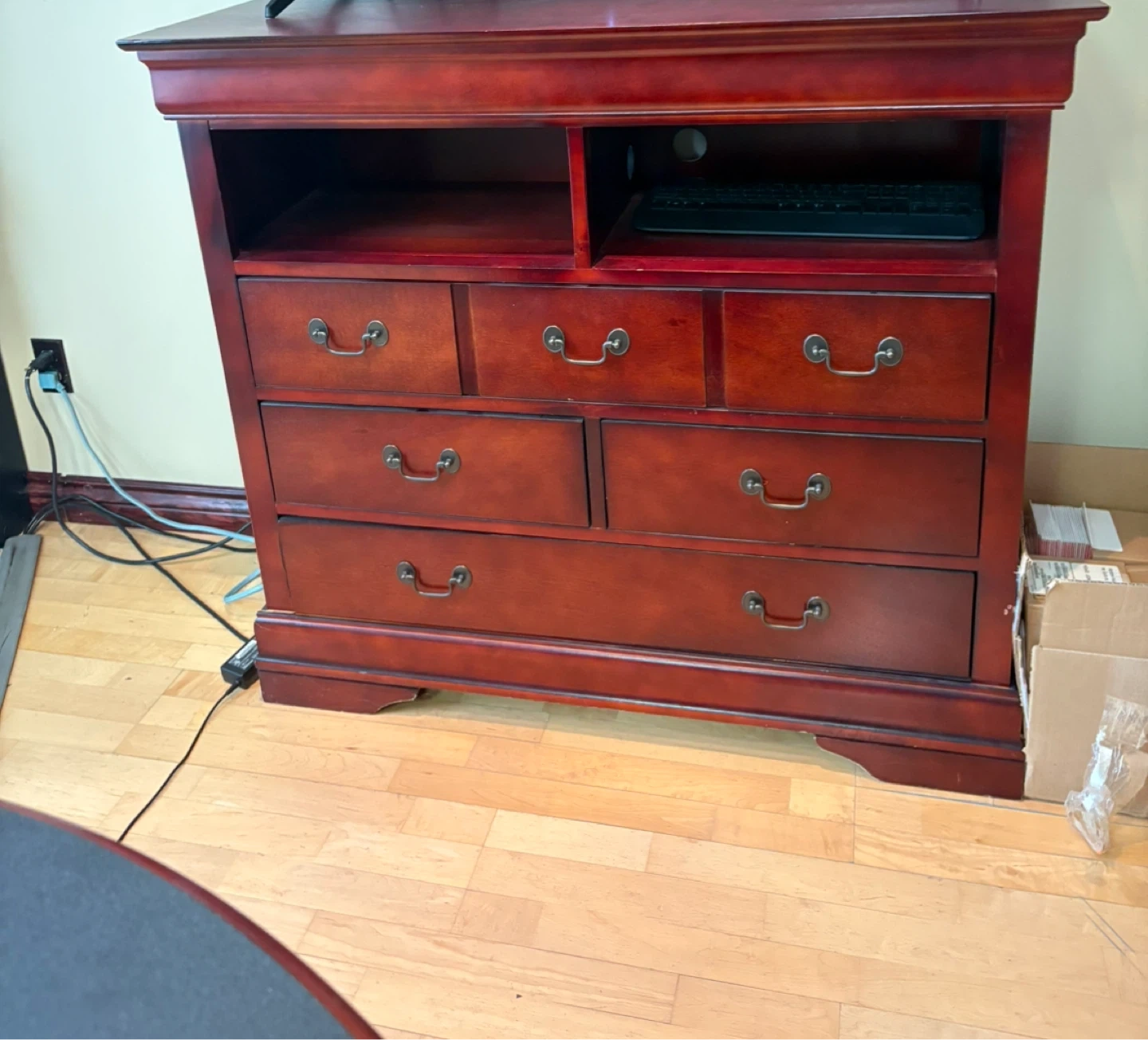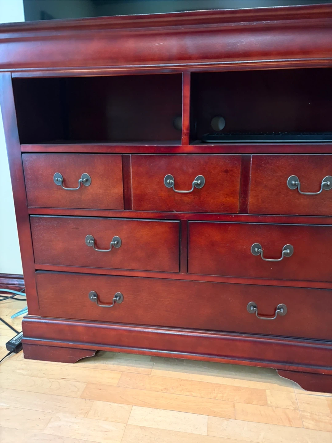This TV stand is made of red cherry wood. It features two open shelves and seven drawers for storage. This piece would be useful for organizing media consoles and keeping your living room tidy.