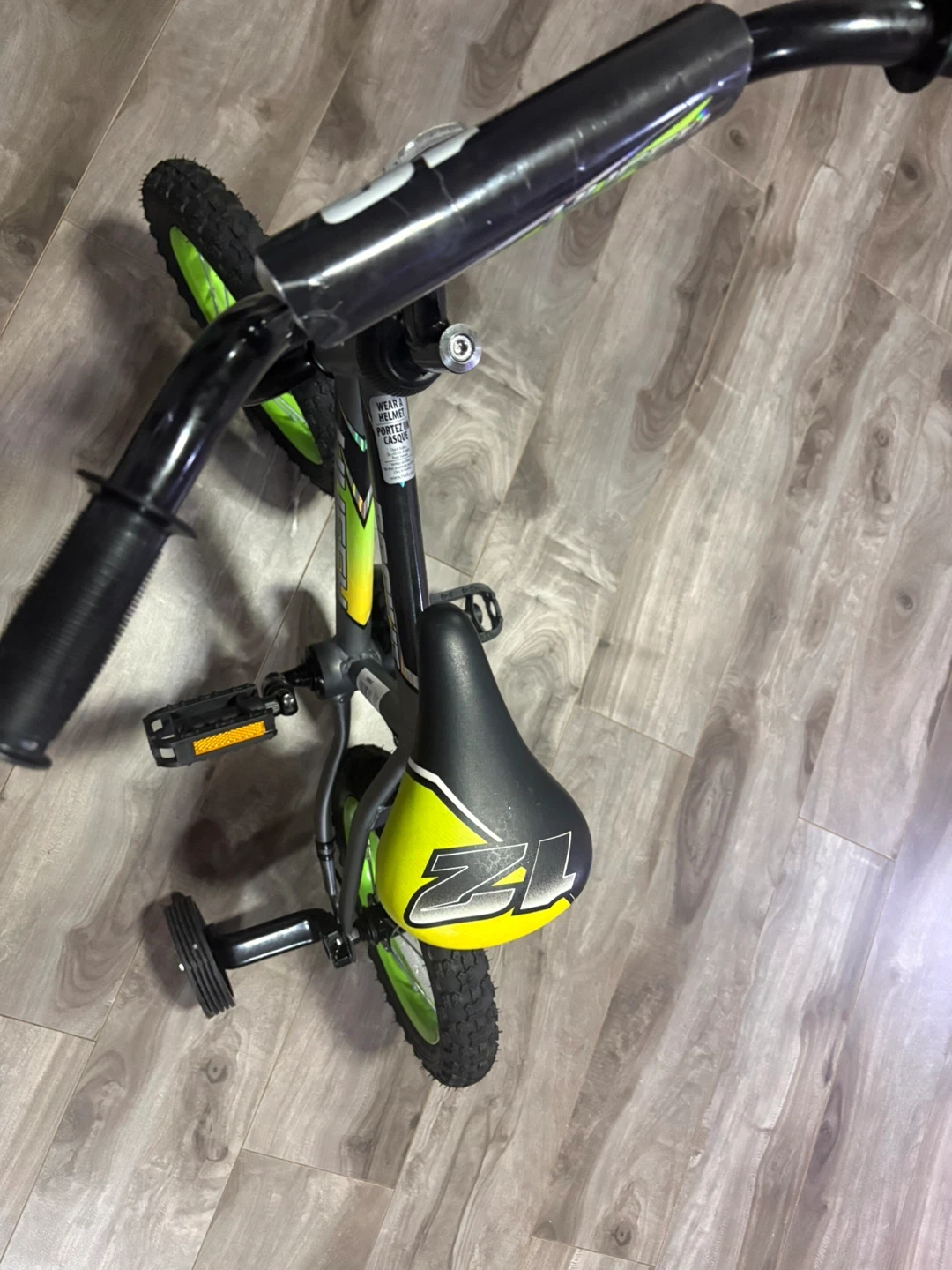 This Huffy Rock It kids bike features a cool grey and neon green design. It comes with training wheels, making it a great starter bike for young riders. Durable construction for many adventures!