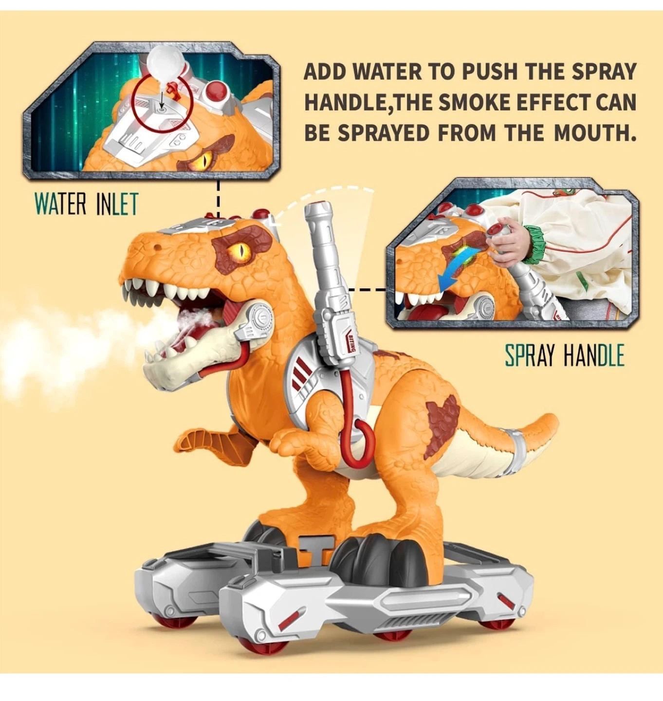 Fun and Functional Details π¦π¦: Includes a spray handle and water inlet for misting action through the dinoβs mouth. Plus, a pulley lock for the wheels ensures extra safety during playtime, preventing unwanted movement.