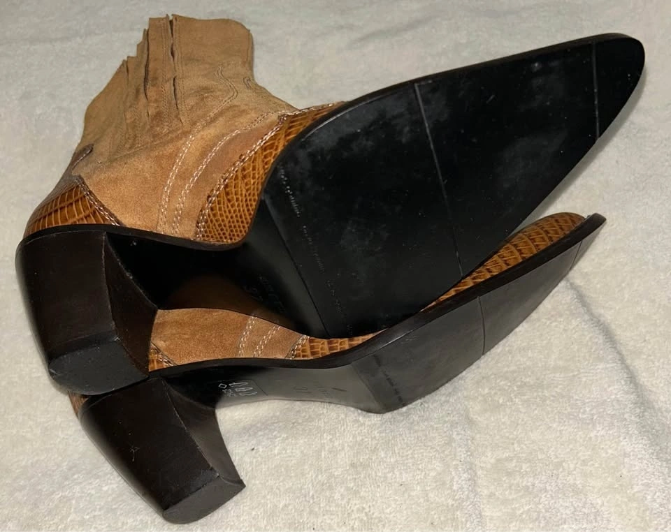 Gorgeous pair of brown leather and suede Barneys New York vintage short, fashion cowboy boots with a pointed toe. Size 37 (6.5-7). Excellent condition, barely worn. Pick up from the upper west side of Manhattan.