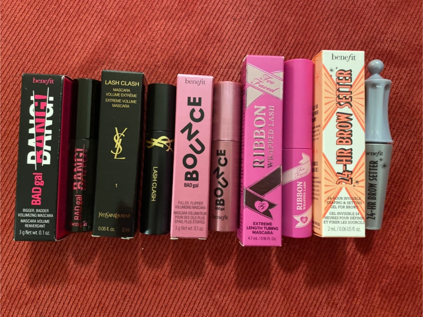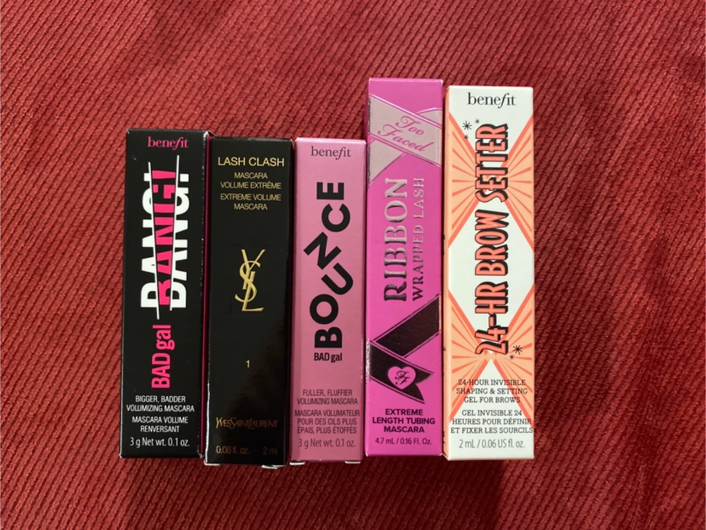 A collection of Benefit Cosmetics mascaras and a brow setter. Includes