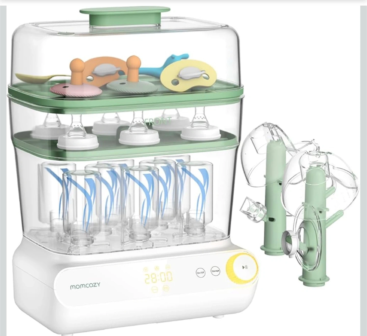 This Momcozy baby bottle sterilizer and dryer is a convenient way to keep your baby's feeding items clean. It's designed to hold multiple bottles and accessories. This unit has a digital display and timer for easy operation. It also includes separate drying racks.