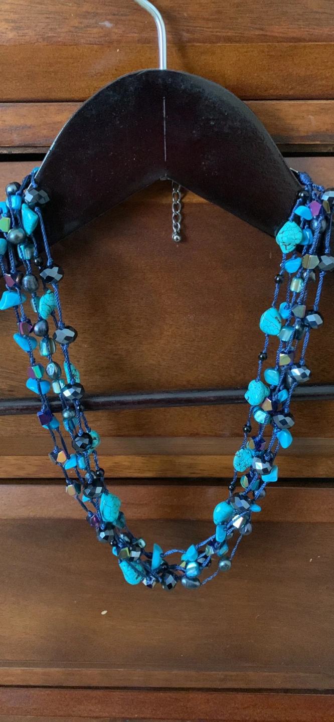 Beautiful multi-strand necklace. Features turquoise and dark crystal beads. Looks great layered or alone. Excellent condition.