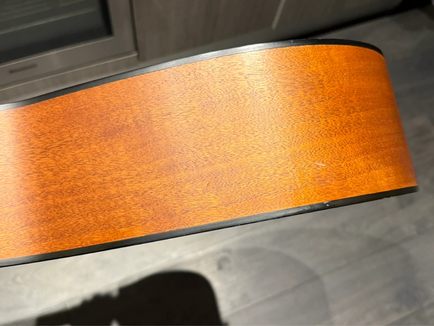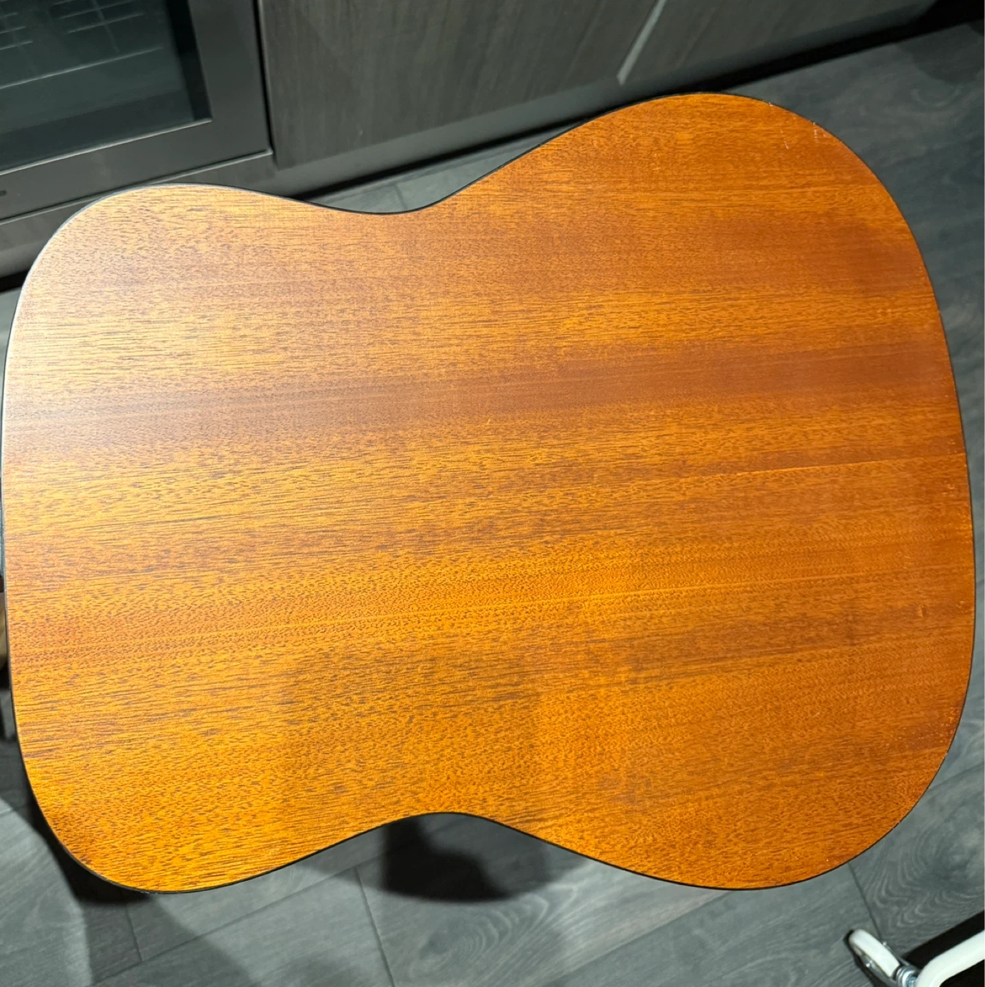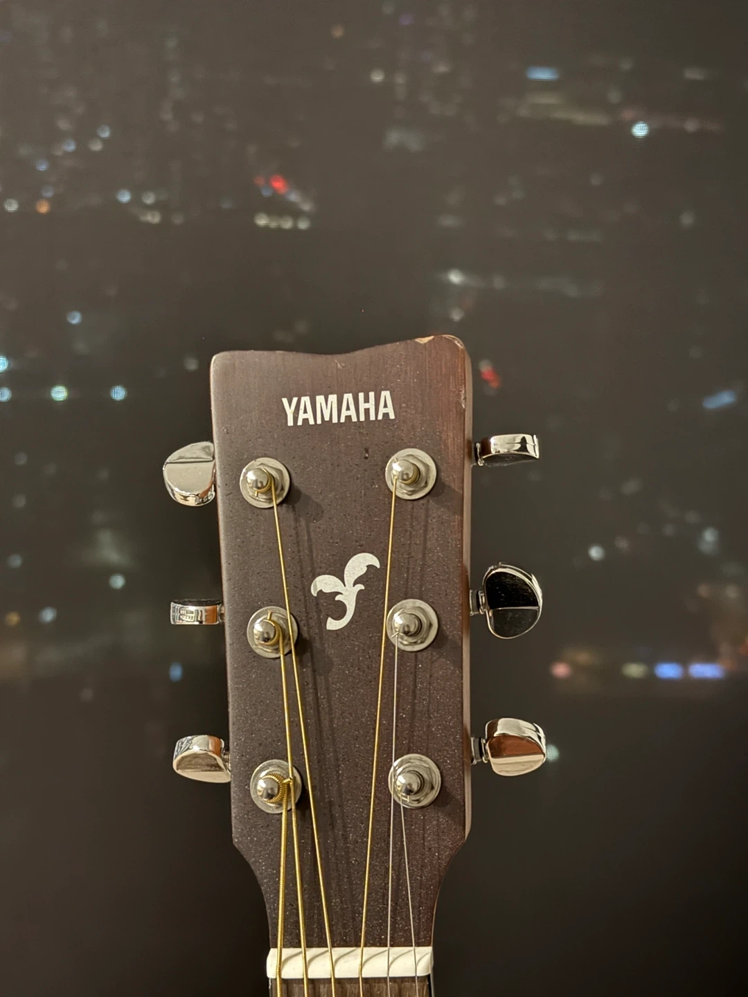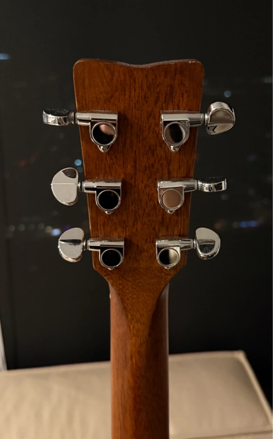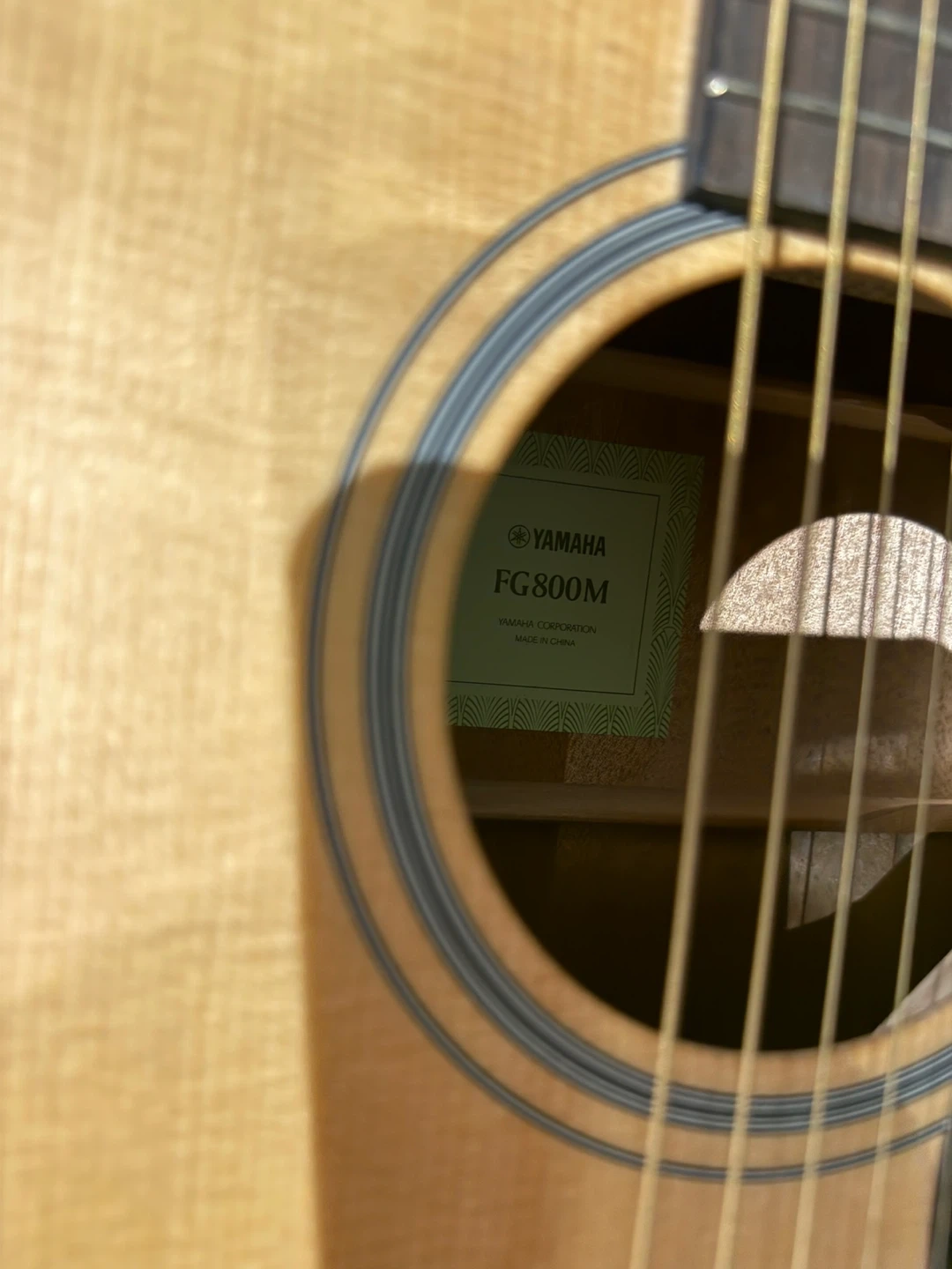 Yamaha FG800M acoustic guitar. Natural wood finish with a tortoise shell pickguard. Mahogany neck and body. Tuners are in good working order. This guitar's smaller body size makes it comfortable to play.