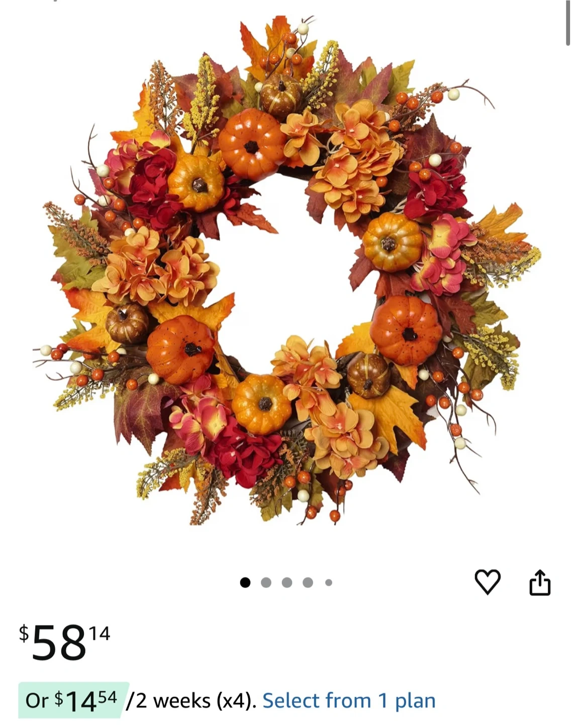 This beautiful fall harvest wreath is perfect for adding a touch of autumn to your home. It features a variety of colourful leaves, flowers, and pumpkins. It originally sells for $58.14