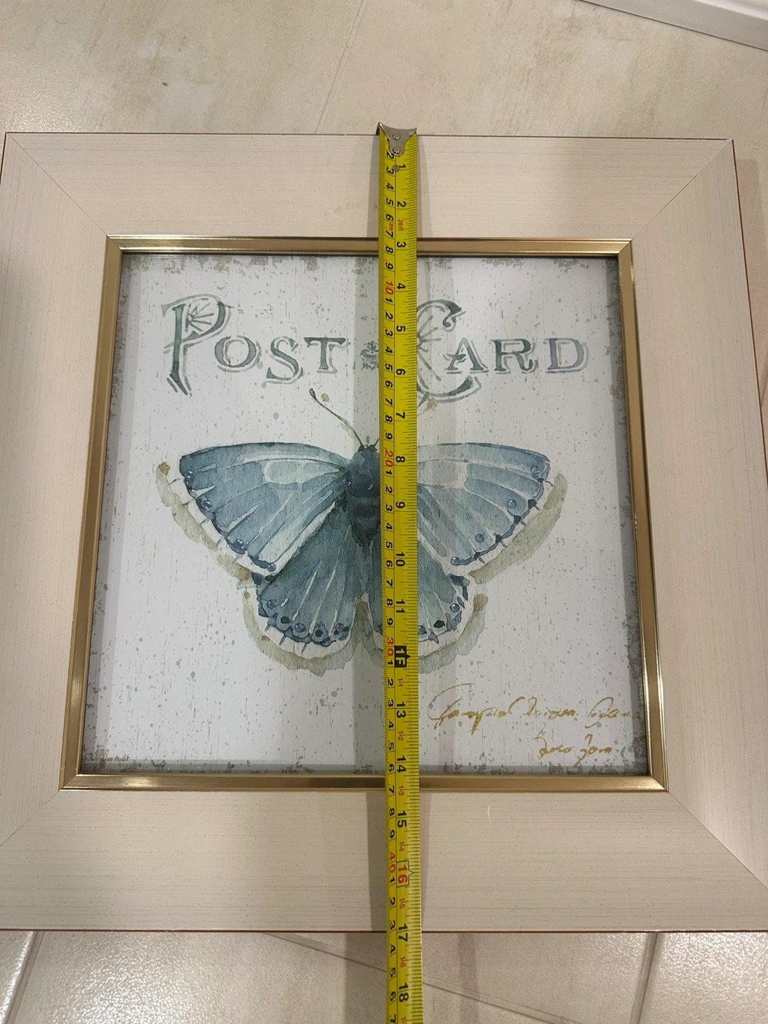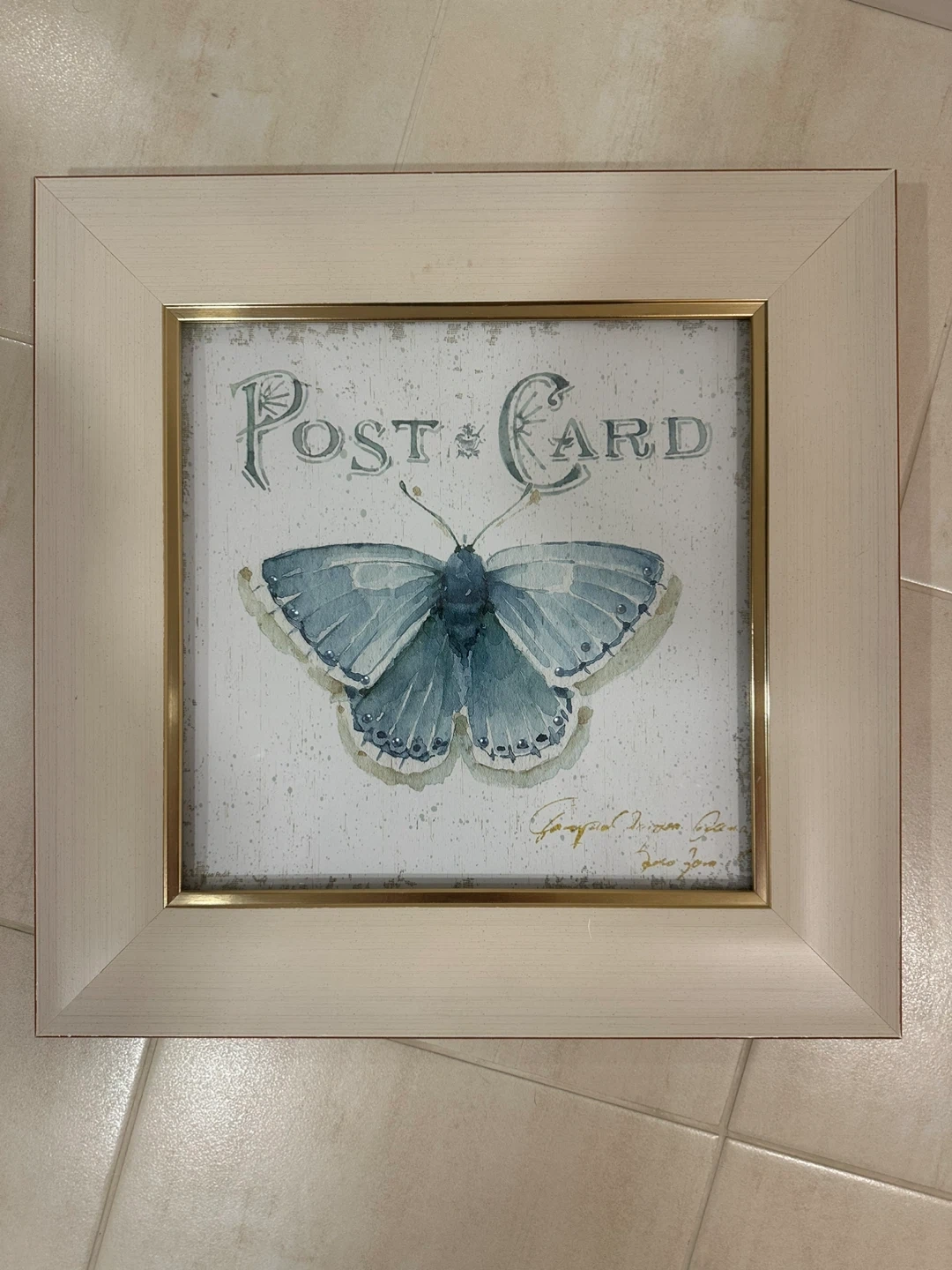 Cream coloured frame with a brass inlay around the artwork. Features a blue butterfly with "Postcard" text in a vintage font. Artwork is approximately 13 x 13 inches. Frame measures 16 x 16 inches.