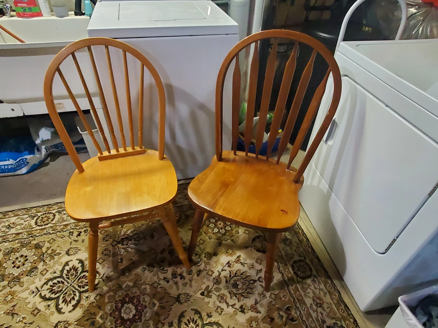 2 rounded back wood chairs, 1 light, 1 dark
