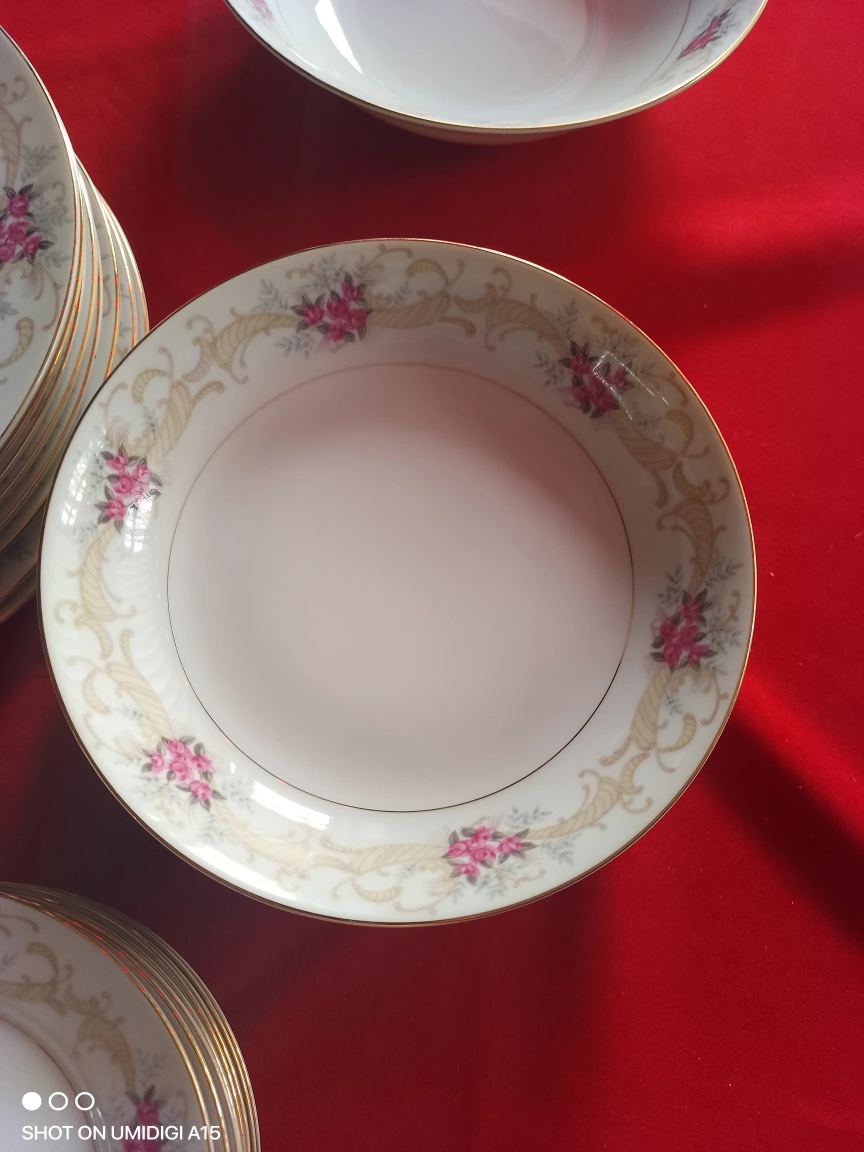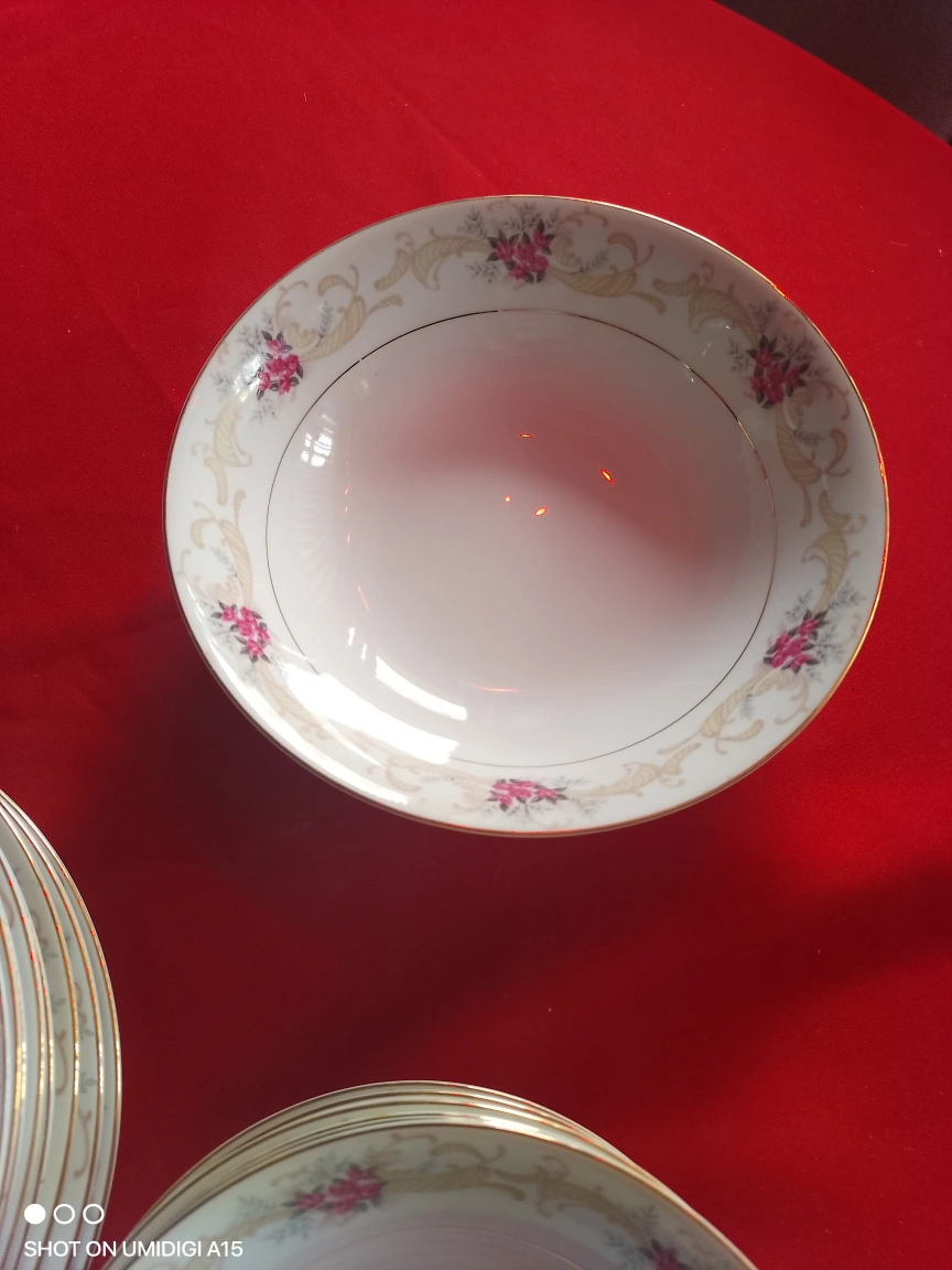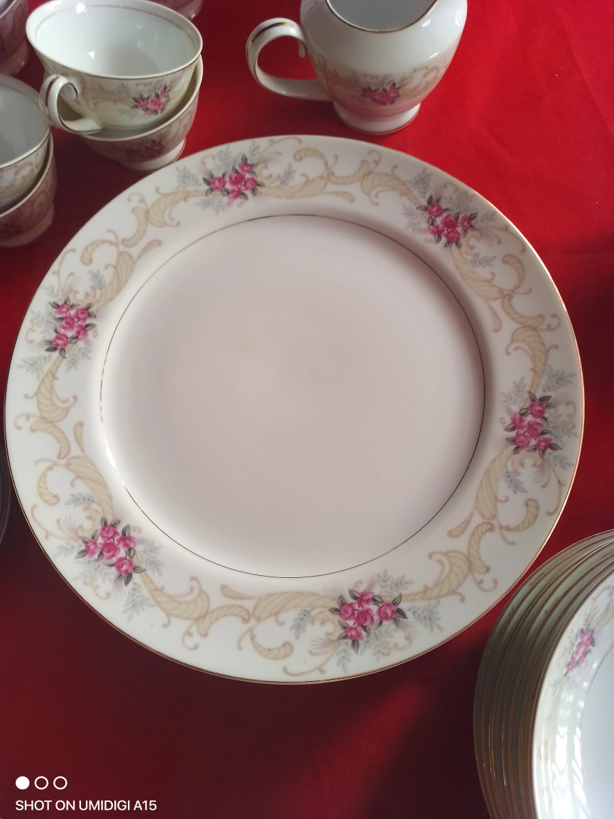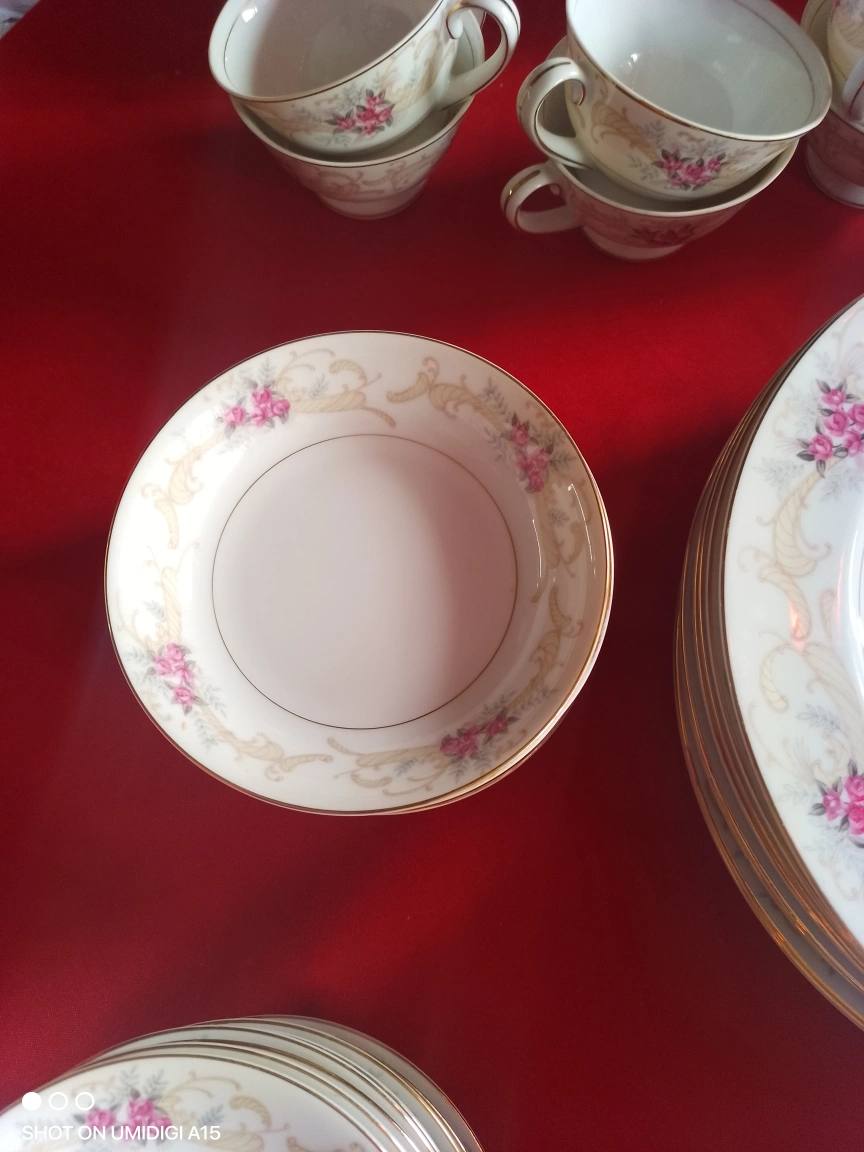 Elegant vintage tea set and dinnerware. Features floral design. Includes cups, saucers, bowls, plates, creamer, and sugar bowl. Gold trim accents. very rare set out of print ....don't let immatations fool u....
