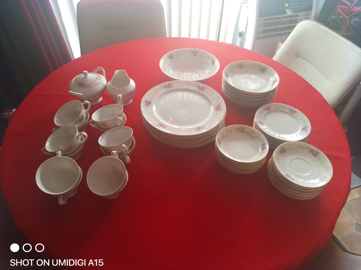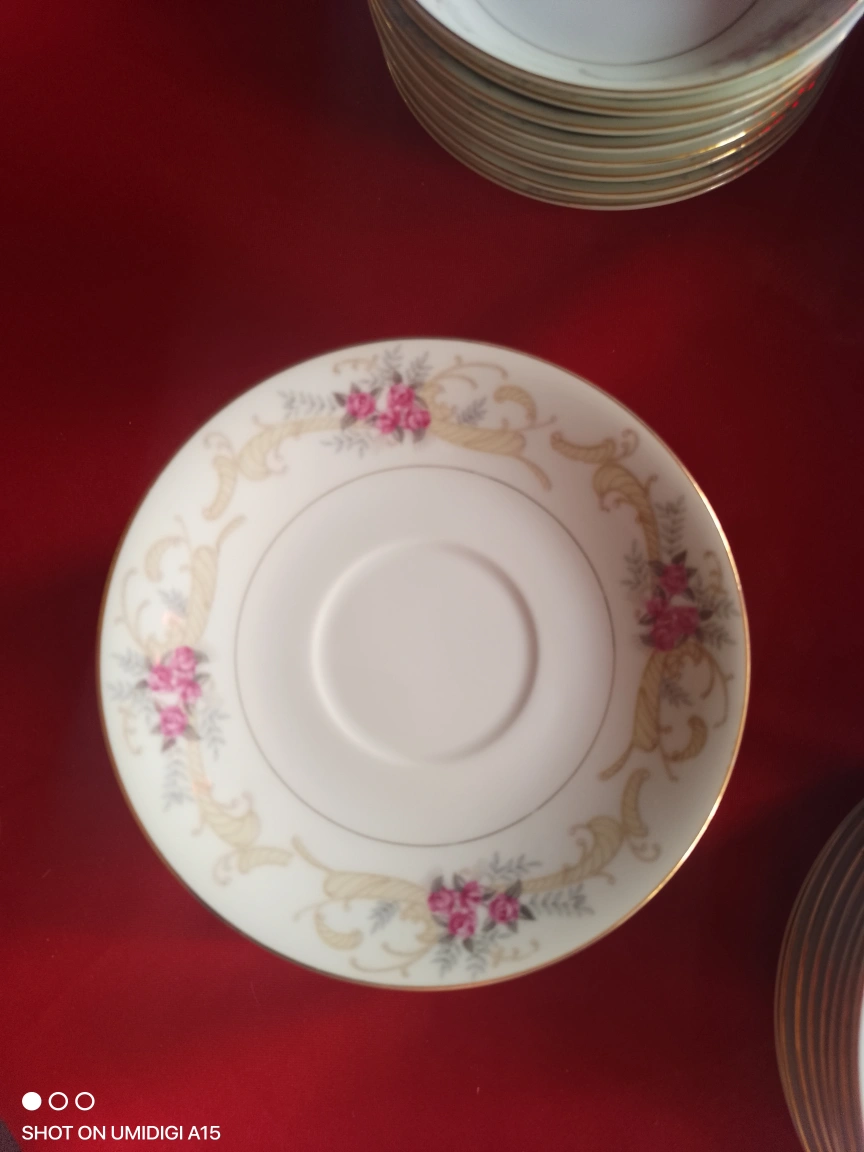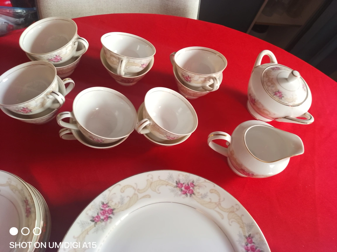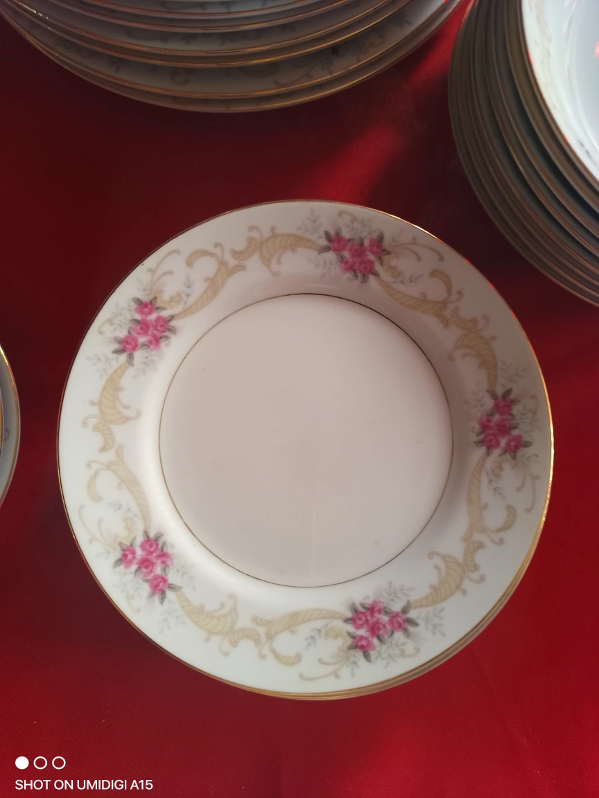 Elegant vintage tea set and dinnerware. Features floral design. Includes cups, saucers, bowls, plates, creamer, and sugar bowl. Gold trim accents. very rare set out of print ....don't let immatations fool u....
