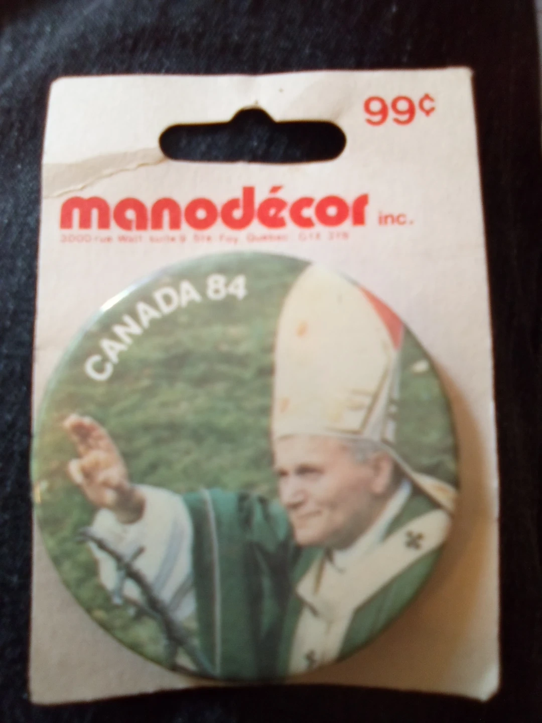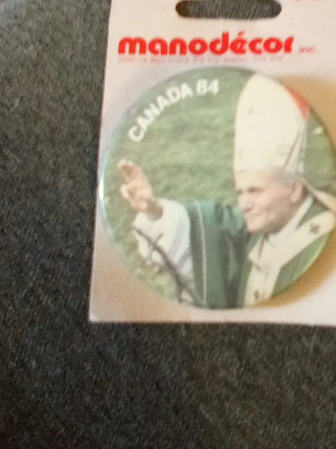 This Manodecor inc. pin features Canada 84 and an image of Pope John Paul II. It's still in its original packaging. The price tag shows 99¢.