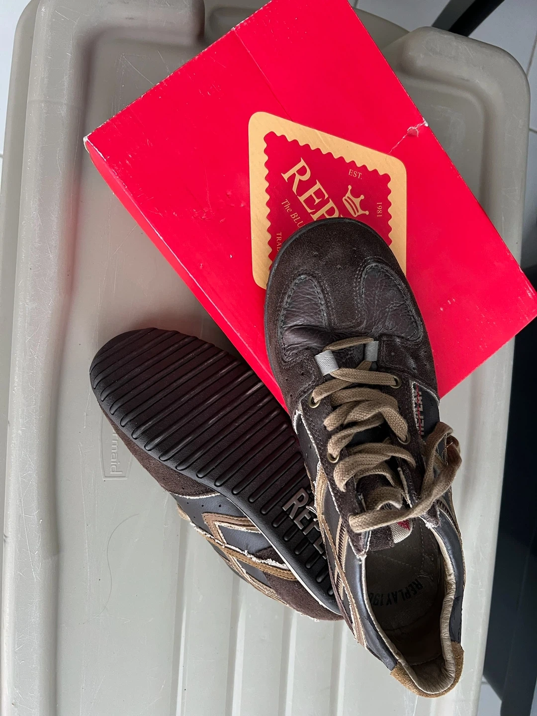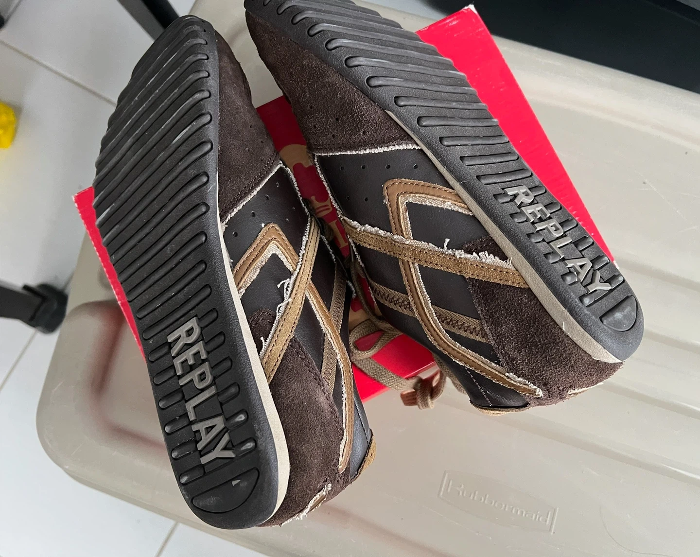 These are new Replay sneakers in a brown colour. They're made with suede and leather details. The shoes come with the original Replay box.