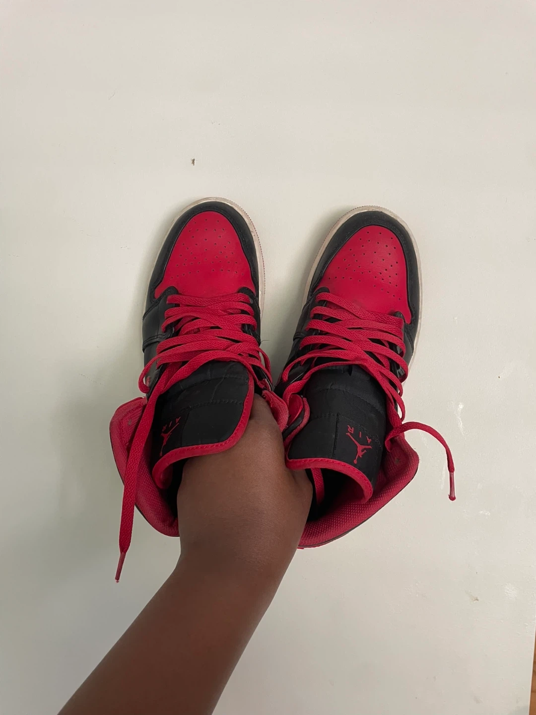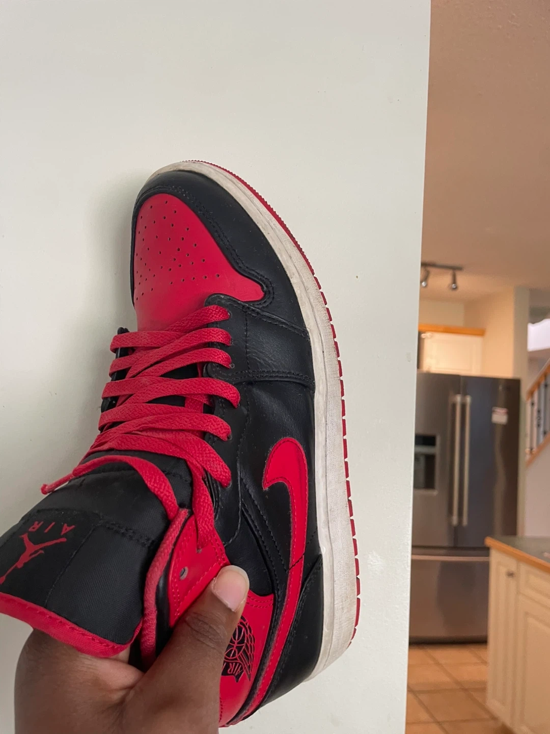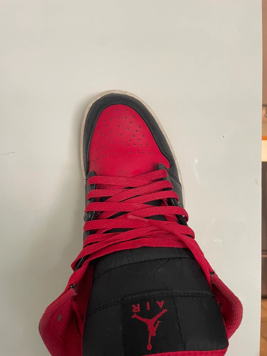 Classic high-top sneakers featuring a black and red colourway. Features leather and synthetic materials. Includes laces and Air cushioning. Good for everyday wear.