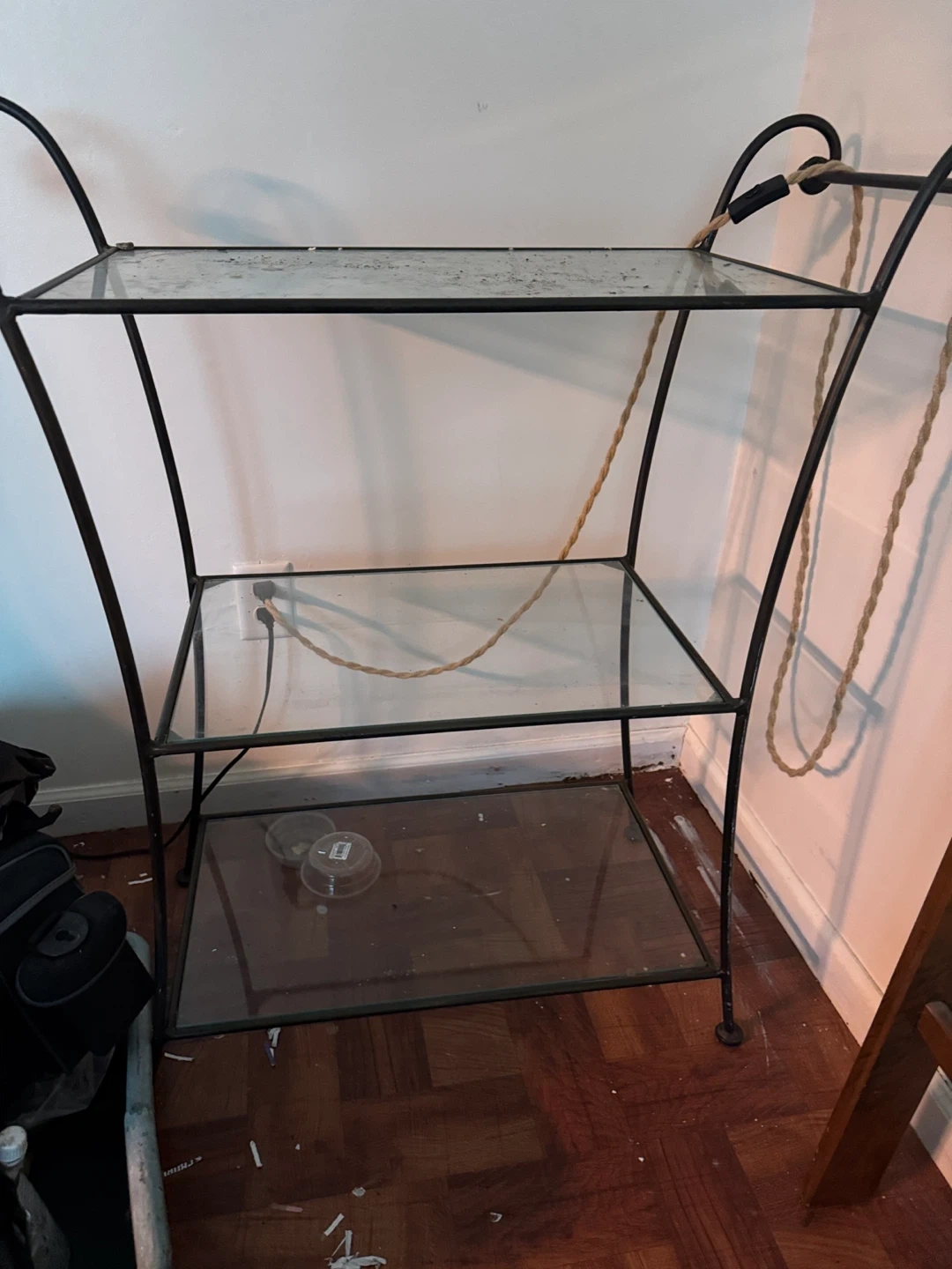 This is a 3-tier shelf unit with a metal frame and glass shelves. It's a versatile piece for storage or display. The frame has decorative scrollwork. Shelves are made of clear glass.